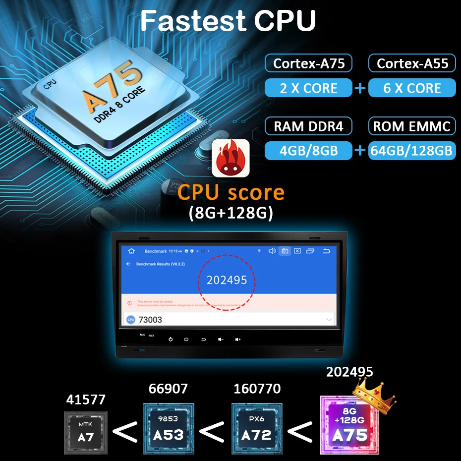 PX6PX6 является лучшим чипом на рынке в настоящее время, он работает быстрее, чем все другие типы. Балл ANTUTU составляет 160770, что лучше 7853 4G + 64G, PX5 и всех других типов 4 + 64G на рынке. По сравнению с другими радио типа fo, PX6 radio может загружать больше видов приложений android с android market, и приложение может работать лучше.