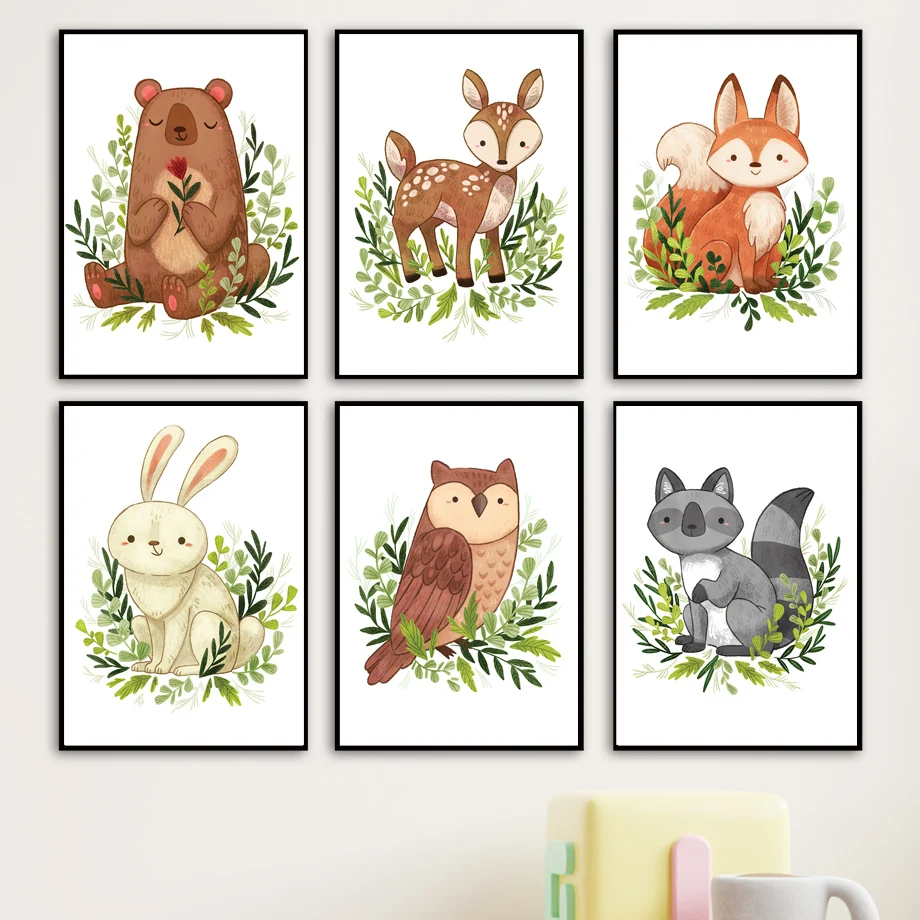 Милый медведь, лиса, олень, енот, Детская настенная живопись, холст...