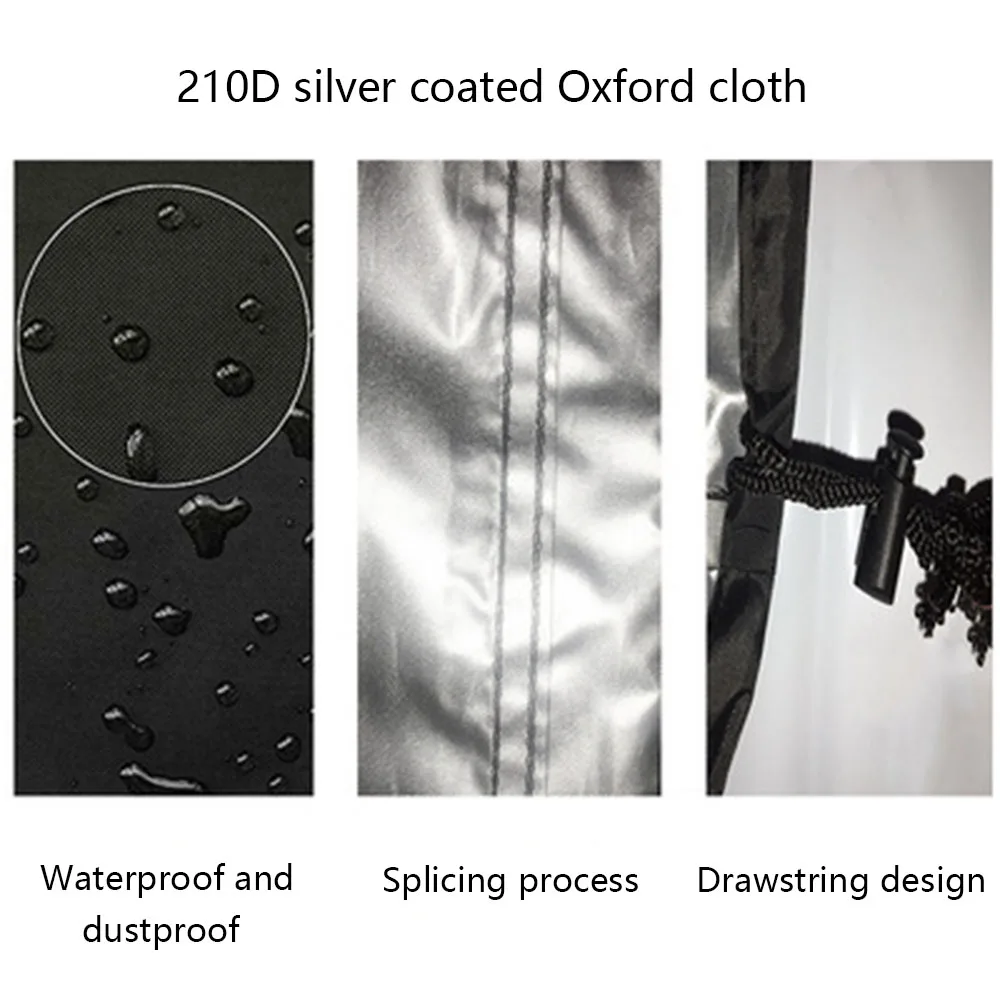 Этот продукт использует 210D ткань Оксфорд с покрытием из ПУ посеребренной водонепроницаемой посеребренной ткани (Посеребренная может предотвратить ультрафиолетовые лучи и рассеивание тепла).Он предотвращает снег и мороз зимой, затенение летом и предотвращает появление падших листьев осенью, а также предотвращает появление пыли.Простая установка, светильник вес, легко складывать и носить с собой. Нано экологически чистые материалы, антивозрастной, жизненный цикл, водонепроницаемый, анти-ультрафиолетовый, теплоотвод, твердость лучше, чем полиэфирные материалы.
