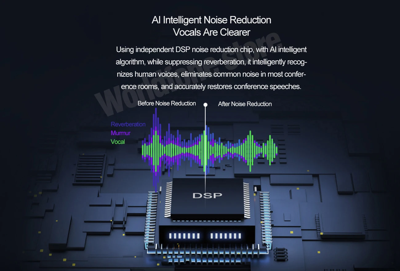 Используя независимый чип шумоподавления DSP, с алгоритмом AI itelligent, подавляя реверберации, он восстанавливает человеческий голос, устраняет общий шум в большинстве комнат confer-ence и точно восстанавливает выступления на Конференции.