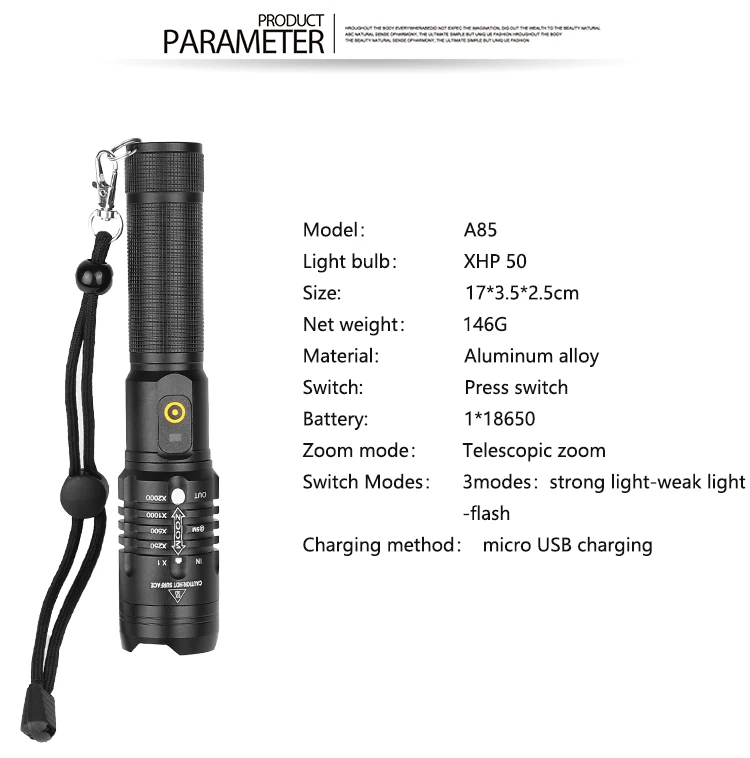 Модель: A85Лампа: XHP 50Размер изделия: 17*3,5*2,5 смВес нетто 146 гМатериал: алюминиевый сплавАккумулятор: 1*18650 (не входит в комплект)Метод зарядки: поддержка зарядки micro USBМетод масштабирования: телескопический зумПереключатель: нажмите переключательПоложение шестерни: 3 шестерни s: сильный светильник-слабый светильник-вспышкаХарактеристики: скрытый входной и выходной интерфейс, функция напоминания о низком заряде батареи
