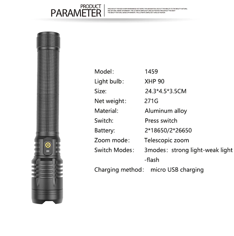 Модель: A85-BЛампа-светильник: XHP70Размер продукта: 18*4,5*3,5 смВес нетто: 255 гЛюмены: фактические Люмены 1500лмМатериал: алюминиевый сплавПереключатель: нажмите переключательАккумулятор: 1*26650/1*18650/3 * AAA (не входит в комплект)Метод зарядки: поддержка зарядки micro USBПоложение шестерни: 5 передач s: 100%-70%-50%-вспышка-SOS, длительное нажатие для выключенияМетод масштабирования: телескопический зумХарактеристики: вход и выход, напоминание о низком заряде батареи