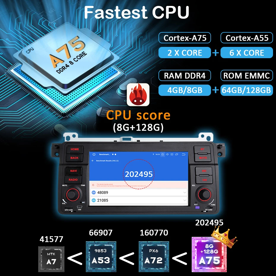 PX6PX6 является лучшим чипом на рынке в настоящее время, он работает быстрее, чем все другие типы. Балл ANTUTU составляет 160770, что лучше 7853 4G + 64G, PX5 и всех других типов 4 + 64G на рынке. По сравнению с другими радио типа fo, PX6 radio может загружать больше видов приложений android с android market, и приложение может работать лучше.