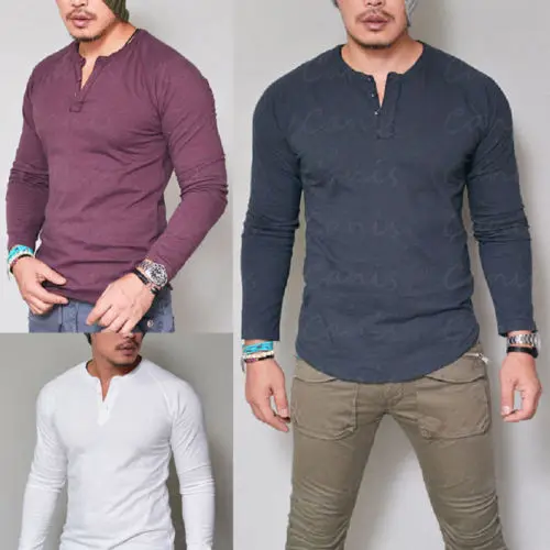 Модные мужские хлопковые тонкие фитнес v-образным вырезом кнопки бл...