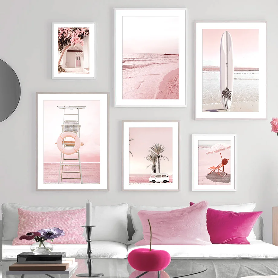Розовое море, пляж, доска для серфинга, пальма, цветок, настенное искусство, холст, живопись, скандинавские плакаты и принты, настенные картины для декора гостинойМатериал: экологически чистый хлопокХарактеристика: солнцезащитный, водонепроницаемый, никогда не выцветает