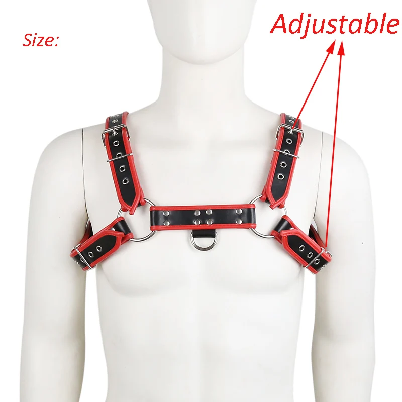 Этот кожаный ремень имеет очень регулируемые серебристые хромированные пряжки на плечах, груди и туловище.