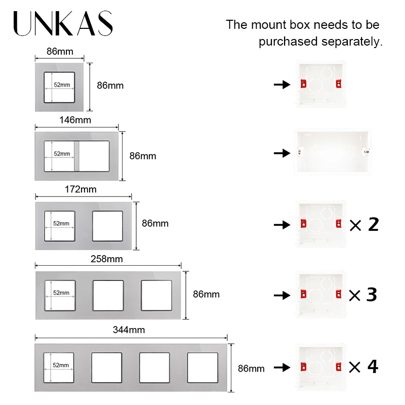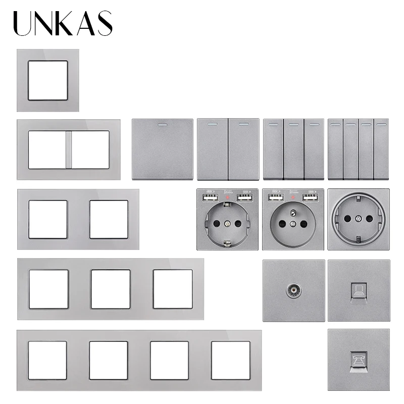 UNKAS комбинированная панель из серого стекла, для самостоятельной сборки, французская розетка европейского стандарта, двойной USB 1, 2, 3, 4, 12 кнопочный переключатель