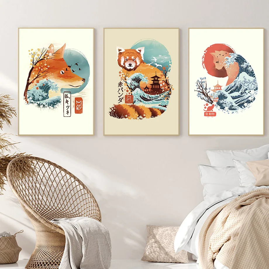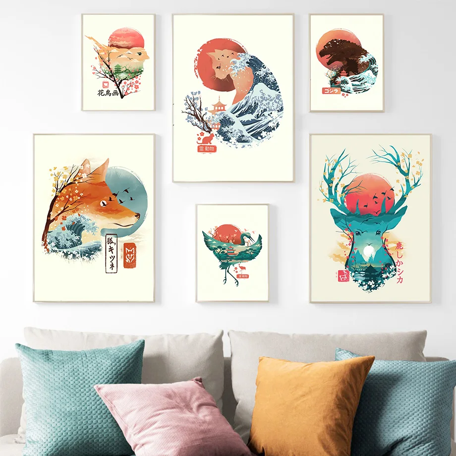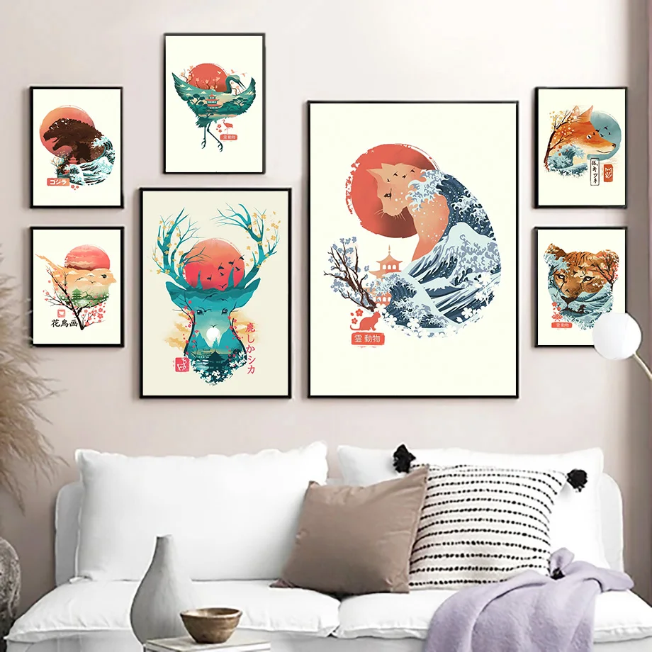 Японская Сакура солнце волна олень лиса Тигр настенная Картина на холсте скандинавские постеры и принты настенные картины для украшения гостиной