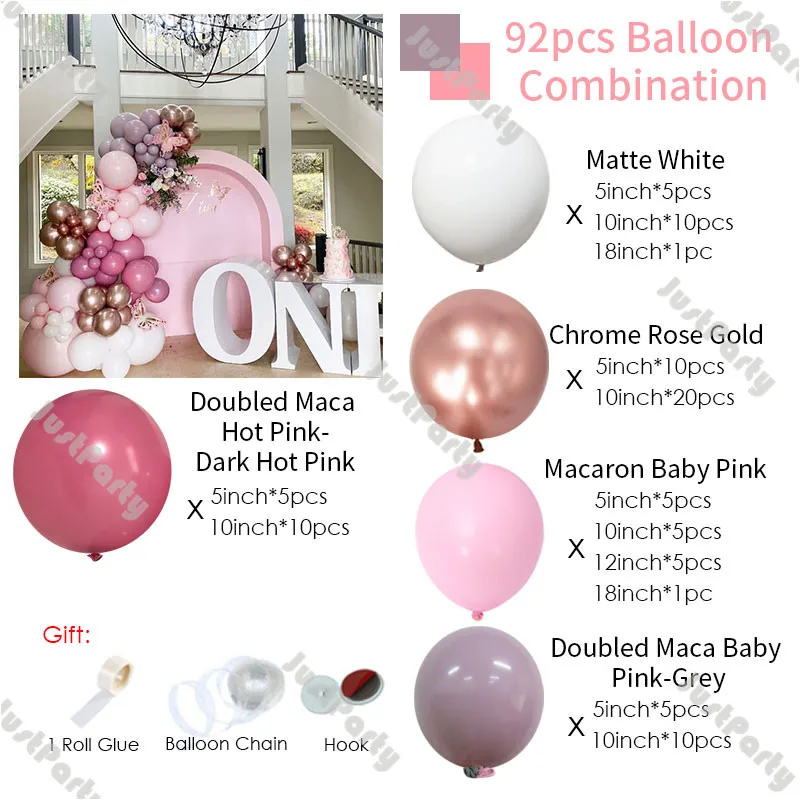 92 шт (9 футов)Шар гирлянда Арка Упаковочный лист:Матовый белый (5 дюймов * 5 шт., 10 дюймов * 10 шт., 18 дюймов * 1 шт.)Хромовое розовое золото (5 дюймов * 10 шт., 10 дюймов * 20 шт.)Macaron Baby Pink(5 дюймов * 5 шт., 10 дюймов * 5 шт., 12 дюймов * 5 шт., 18 дюймов * 1 шт.)Два раза Maca Baby розово-серый (5 дюймов * 5 шт., 10 дюймов * 10 шт.)Двойной Maca ярко-розовый-темно-ярко-розовый (5 дюймов * 5 шт., 10 дюймов * 10 шт.)Бесплатно: 1 рулонный клей (100 шт.)Воздушная цепь * 1(5 м), крючок * 3