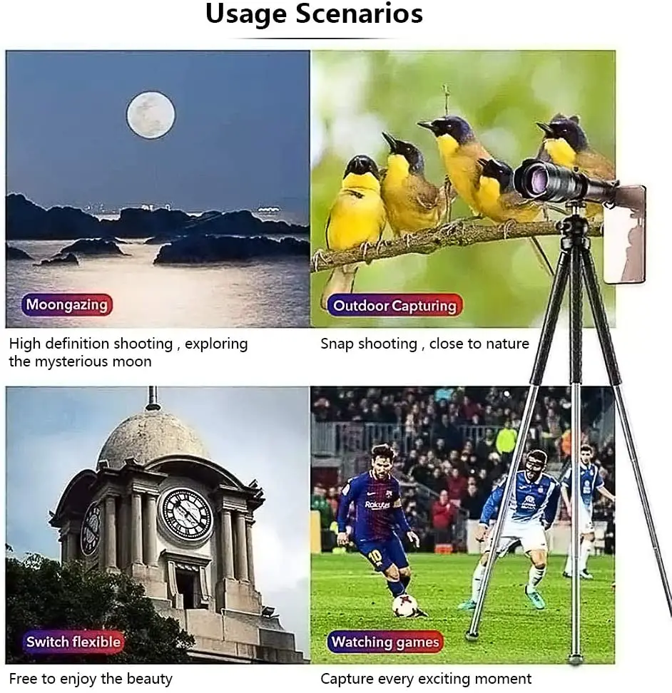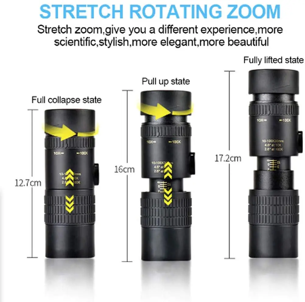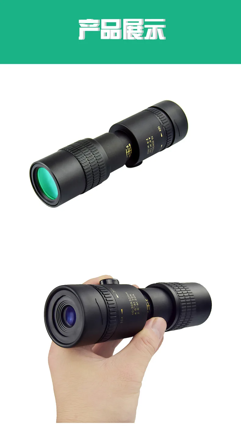 [Монокулярный объектив Super telephoto]: Антивибрационная система телескопа и специальный Трипод 3D гироскоп делают поле зрения телескопа очень стабильным при многократном усилении.[Маленький светильник ночного видения]: встроенная функция ночного видения позволяет использовать его обычно ночью. Включите автофокус и размыйте фоновую функцию, остановите внимание на наблюдении за человеком или объектом, который необходимо наблюдать.[Легкий и портативный]: оболочка изготовлена из titanium сплав, который обладает более высокой удельной прочности и весит всего лишь 1,1 фунтов. При укладке длина составляет всего 7,87 дюйма, и вы можете легко положить его в рюкзак или карман во время охоты, путешествий или кемпинга.[Водонепроницаемый, пыленепроницаемый, ударопрочный дизайн]: заполненные азотом водонепроницаемые и уплотнительные оптические компоненты могут предотвратить попадание влаги, dus и мусора и обеспечить водонепроницаемую функцию жизни.[Идеально подходит для любителей спорта на открытом воздухе и исследователей дикой природы]: ручное оборудование является основным оборудованием для наблюдения за птицами, дикой природы, охоты, туризма, альпинизма, кемпинга, кемпинга, наблюдения и путешествий.Описание: