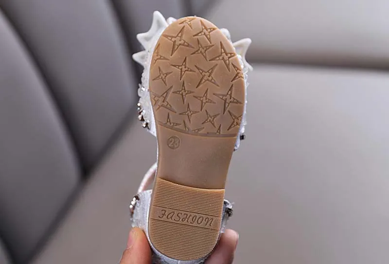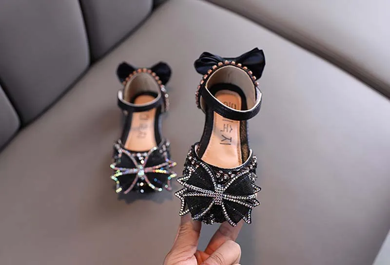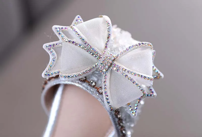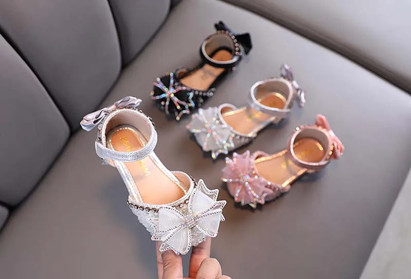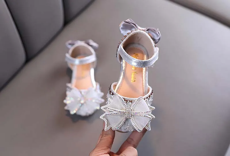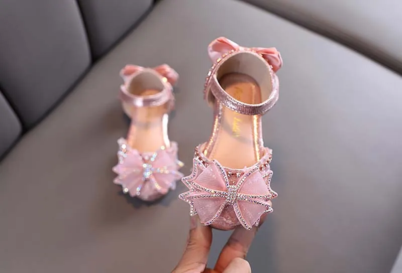 Детские сандалии, для девочек, летние танцевальные туфли со стразами и бантом, с мягкой подошвой, Нескользящие, блестящие туфли принцессы