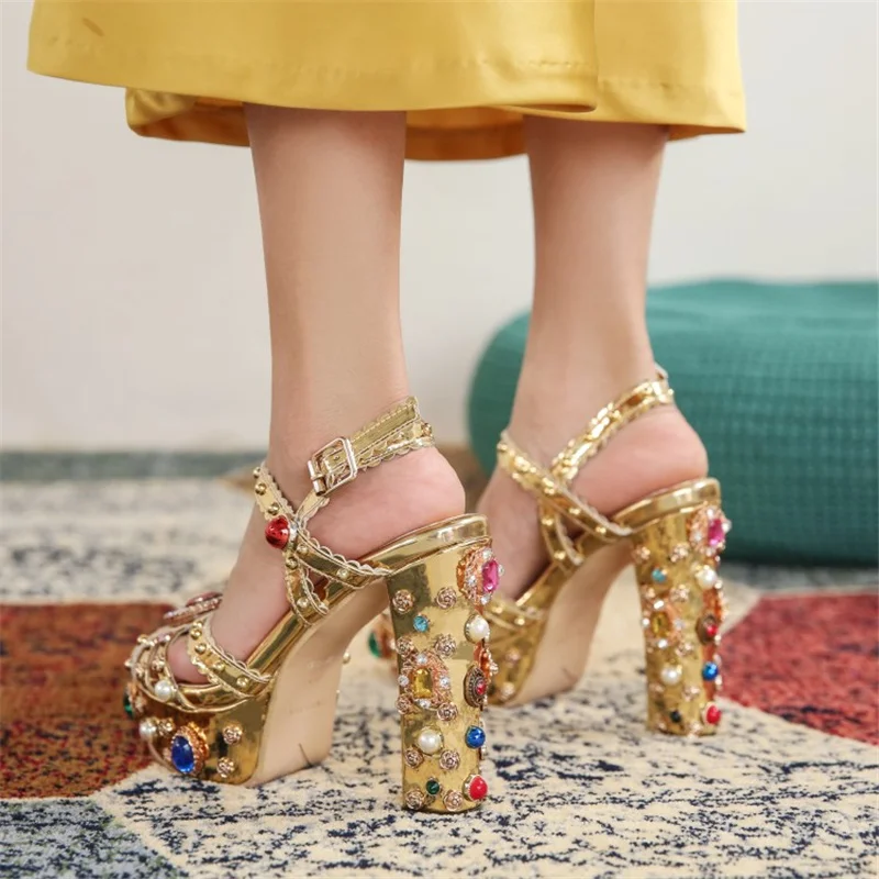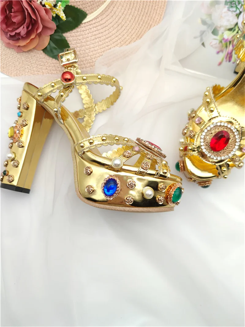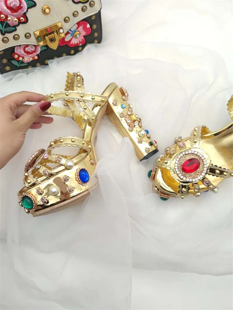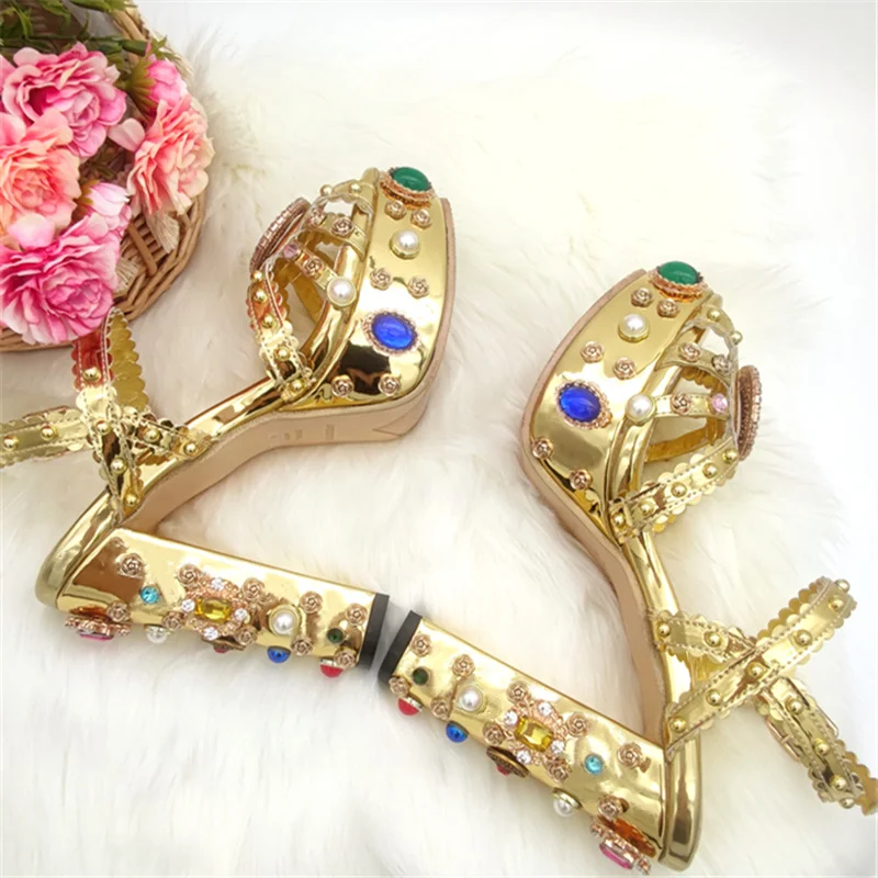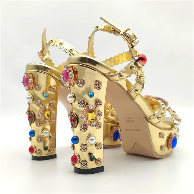 Босоножки женские из натуральной кожи, роскошные сандалии с кристаллами, открытый носок, высокий каблук, ремешок, Классическая обувь для офиса, свадьбы, платформа, цвет золото