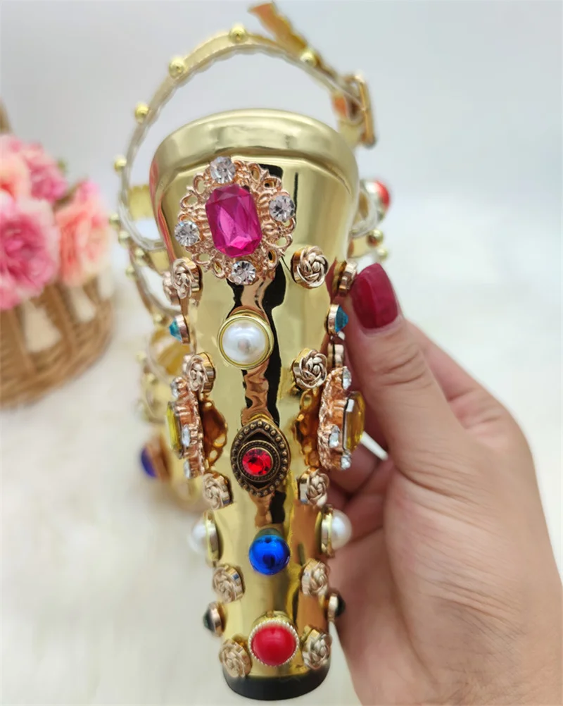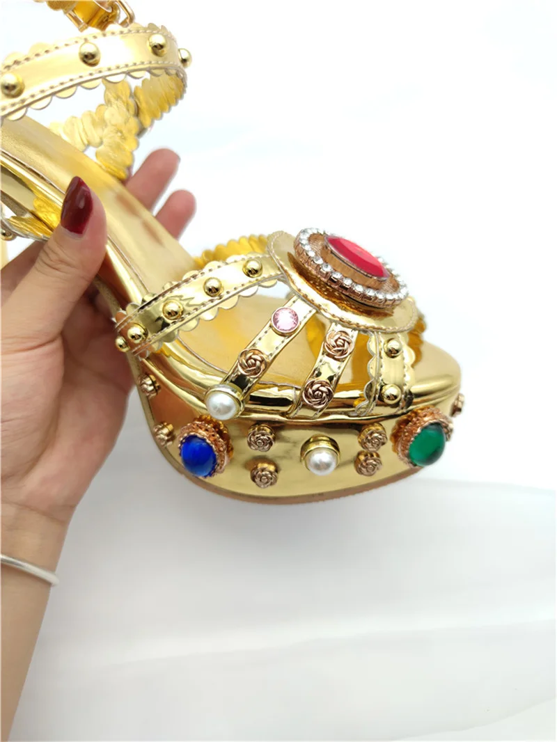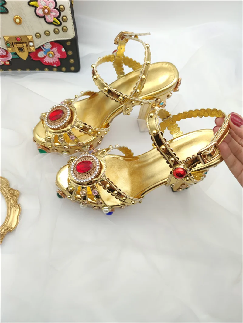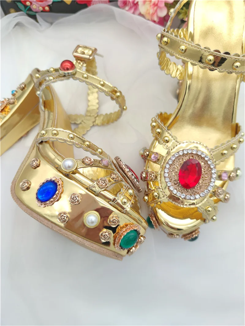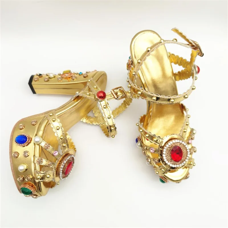 Босоножки женские из натуральной кожи, роскошные сандалии с кристаллами, открытый носок, высокий каблук, ремешок, Классическая обувь для офиса, свадьбы, платформа, цвет золото