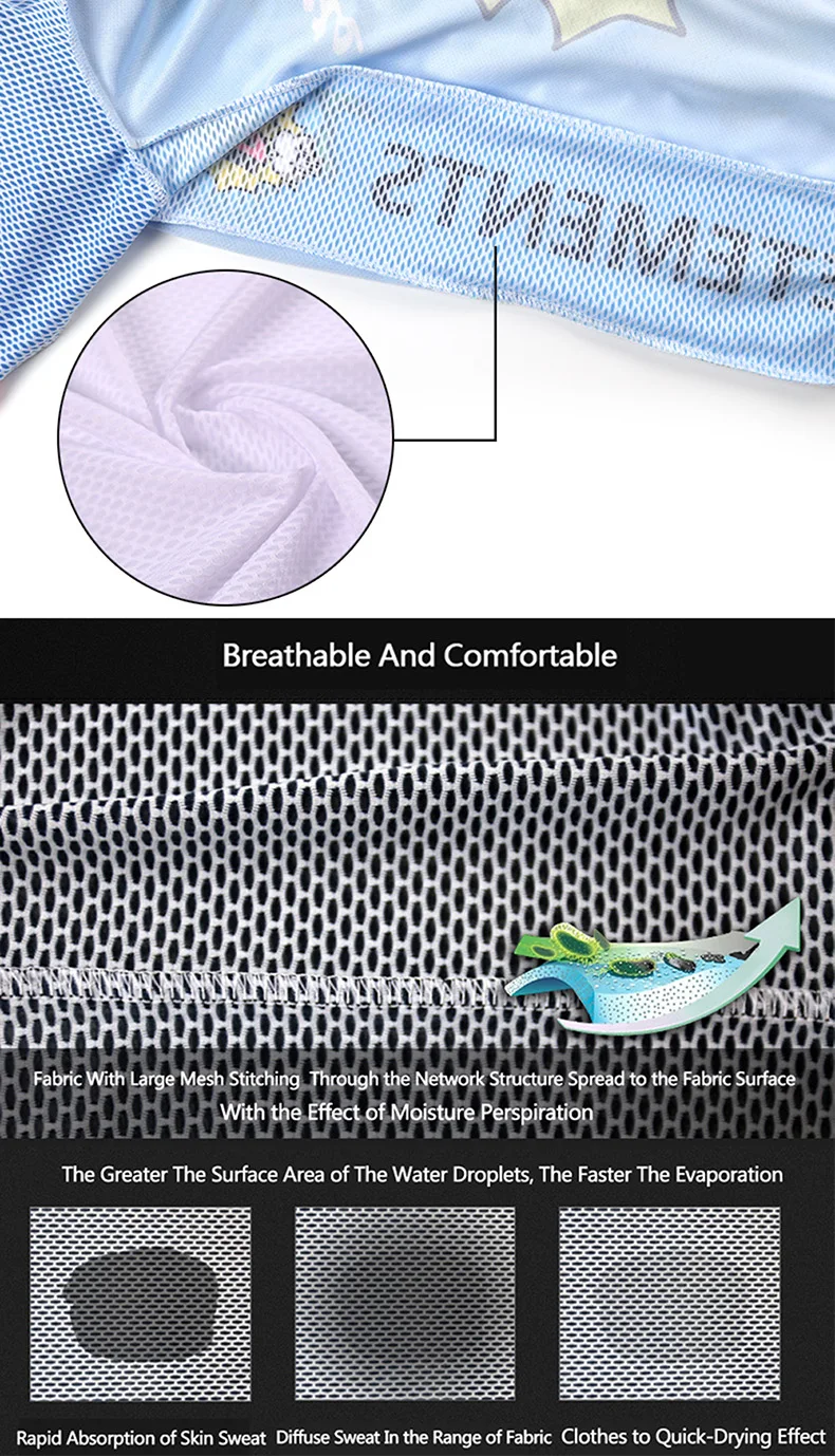 1. Основная ткань: лайкра.2. Нагрудник: дышащий и очень эластичный с большими отверстиями.3. Подушка: синяя 9D дышащая силиконовая подушка.4. Подол: Эластичный Нескользящий ремешок.