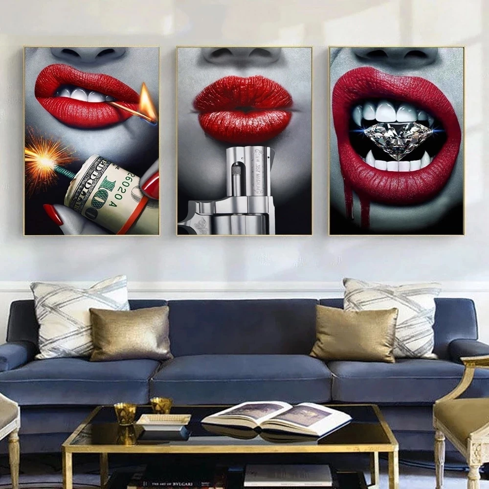 Кроваво-Красная губная помада сексуальная губная помада с пистолетом и деньги холст картины модные плакатов и печать, Картина Настенная для гостиной домашний декор