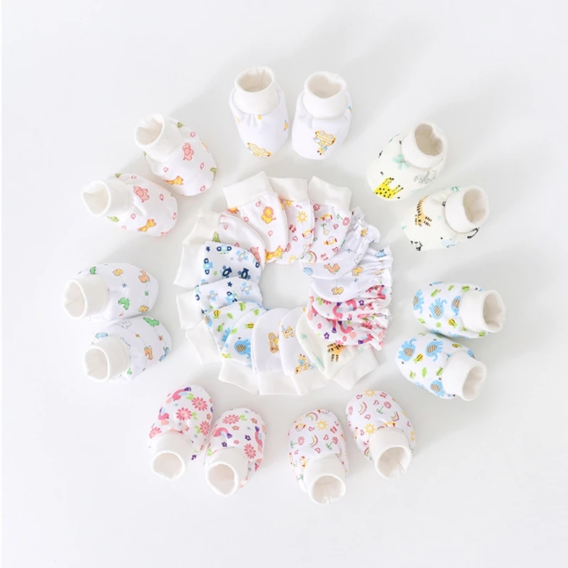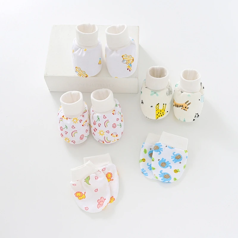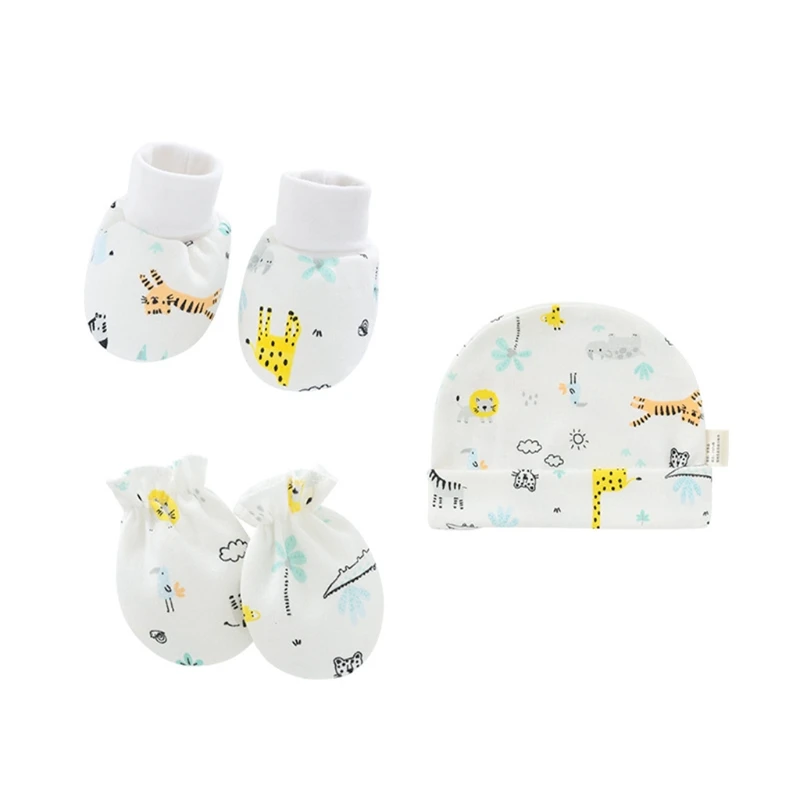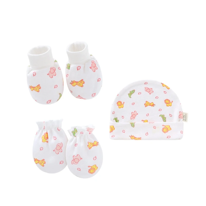 Детские Мультяшные перчатки с защитой от царапин, шапка, чехол для ног, Хлопковые варежки, шапочка, Комплект носков для новорожденных, головной убор