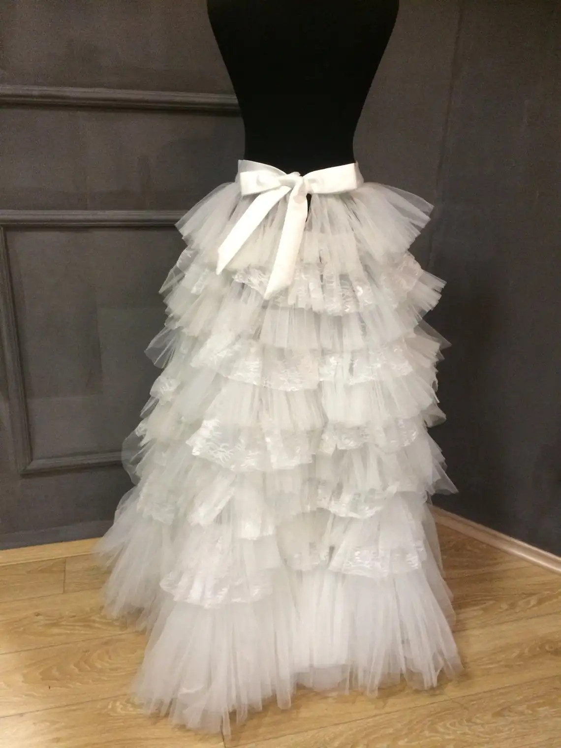 Юбка из тюля белого цвета, пышная юбка в пол с оборками, длинная юбка с бантом на талии, многоярусная юбка, гофрированные длинные юбки