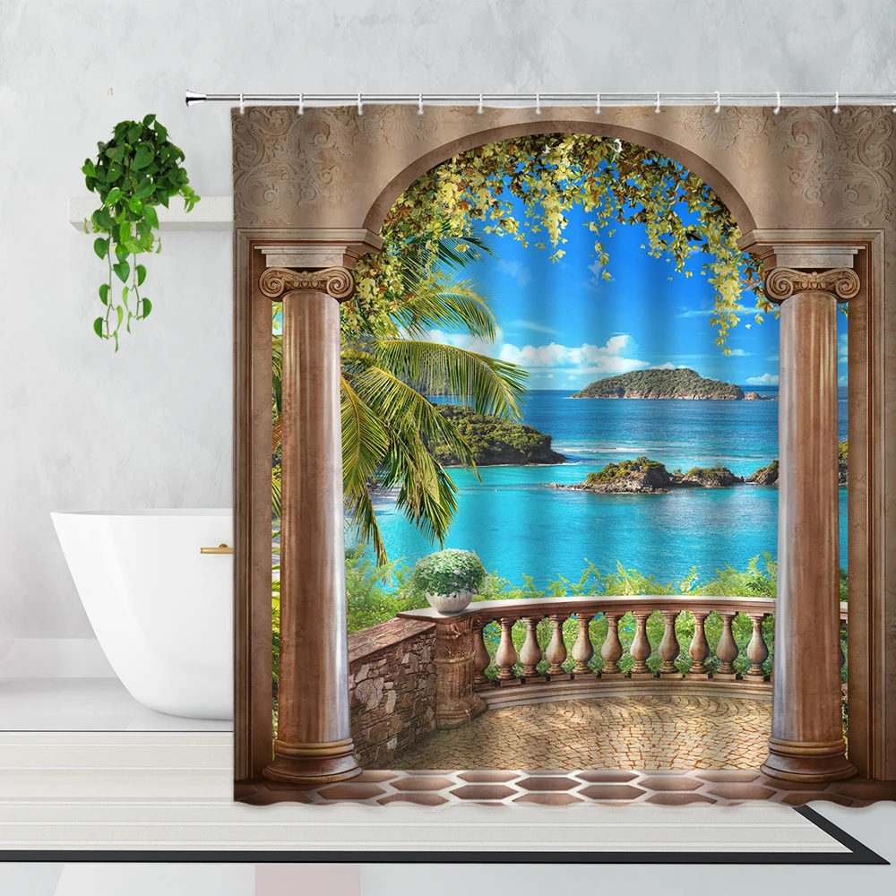 Занавеска для душа Dream свода двери лесной пейзаж океан пляж зелен...