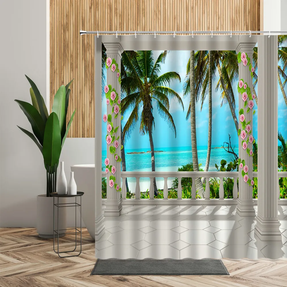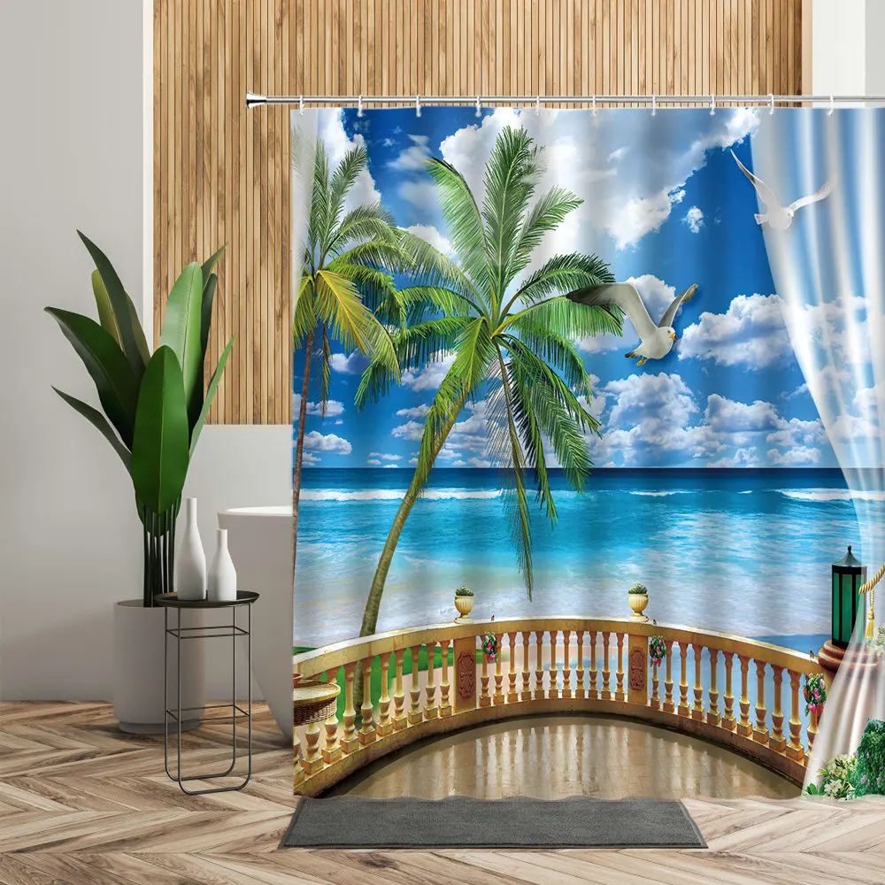 Занавеска для душа с рисунком морского побережья, моря, кокосового ...