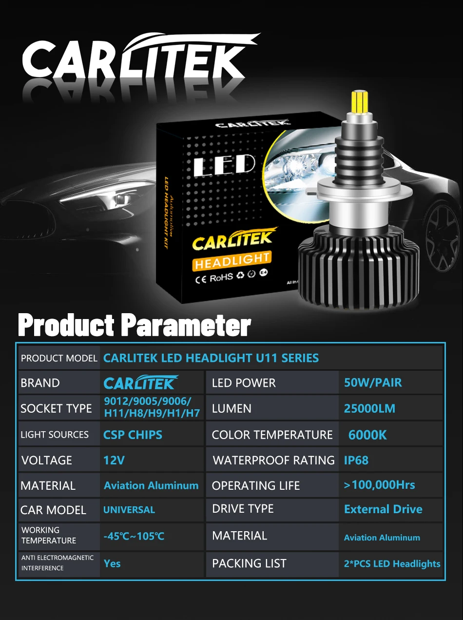 Спрятанная фара Carlitek D2S D4S, 25000LM светодиодный H7 6000K 360...