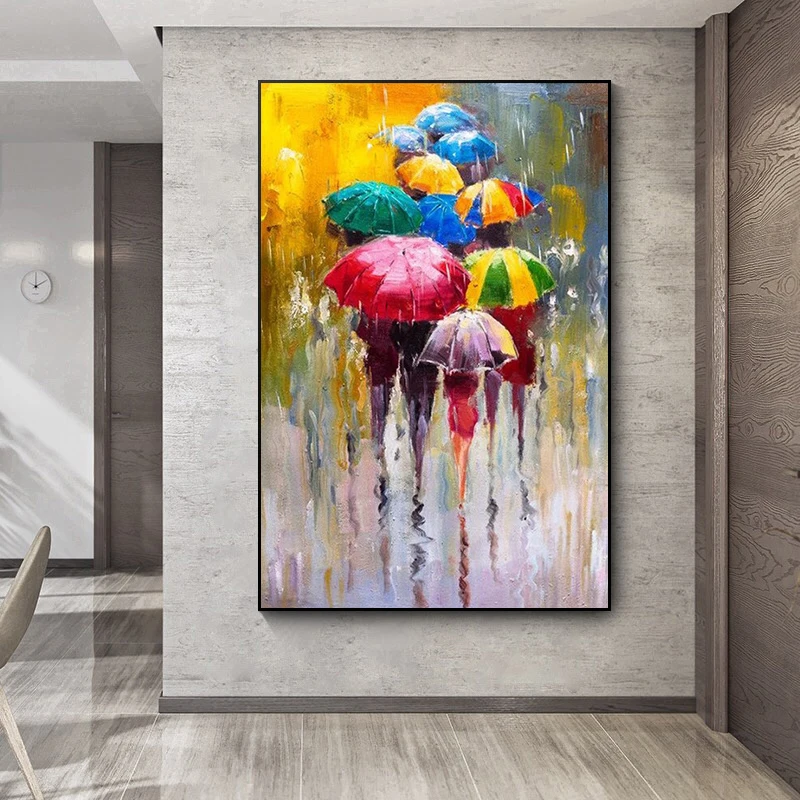 Девушка держит зонт, печатает на картине художественный плакат и печатает картину современного искусства на стене
