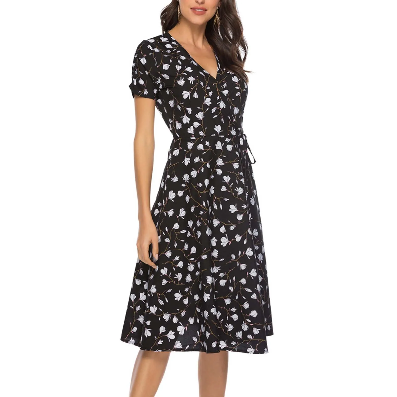 Женское винтажное шифоновое платье с цветочным принтом, коротким рукавом и V-образным вырезом