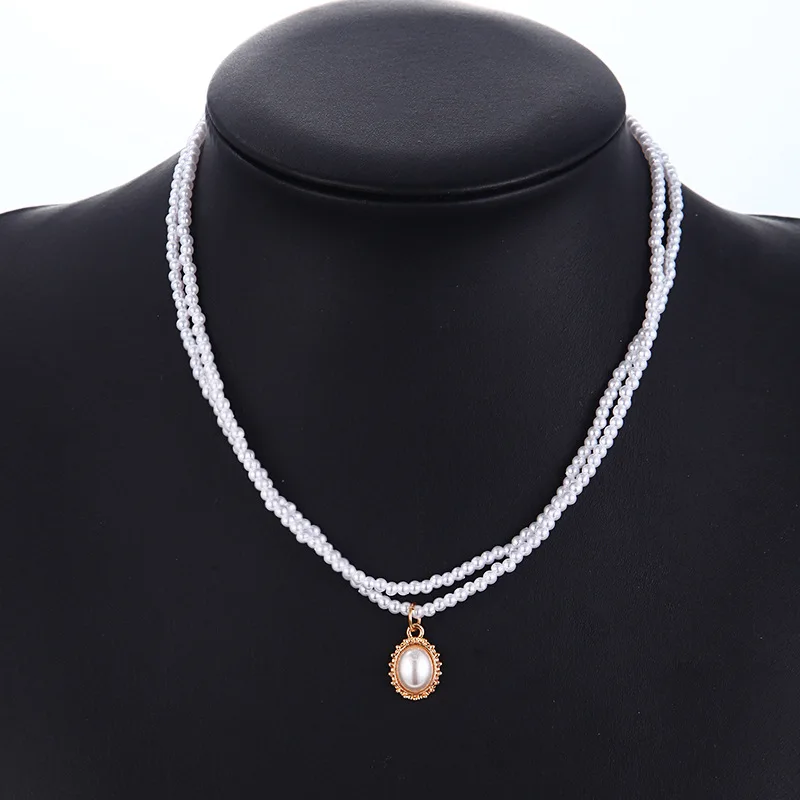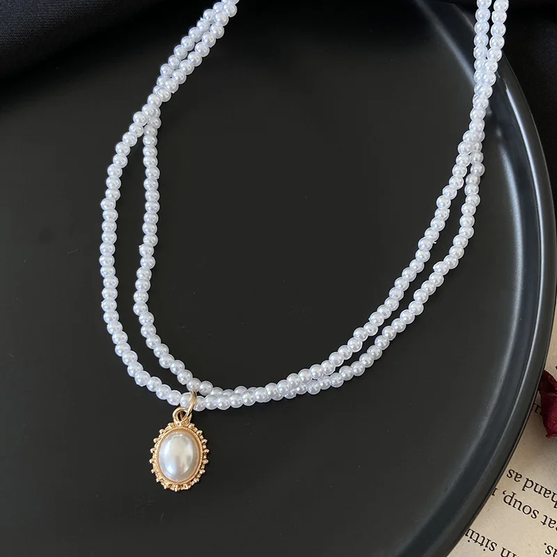 Винтажное Двухслойное жемчужное ожерелье-чокер, Элегантная короткая цепочка, овальная подвеска для девушек, Ювелирное Украшение для свадебной вечеринки, бижутерия