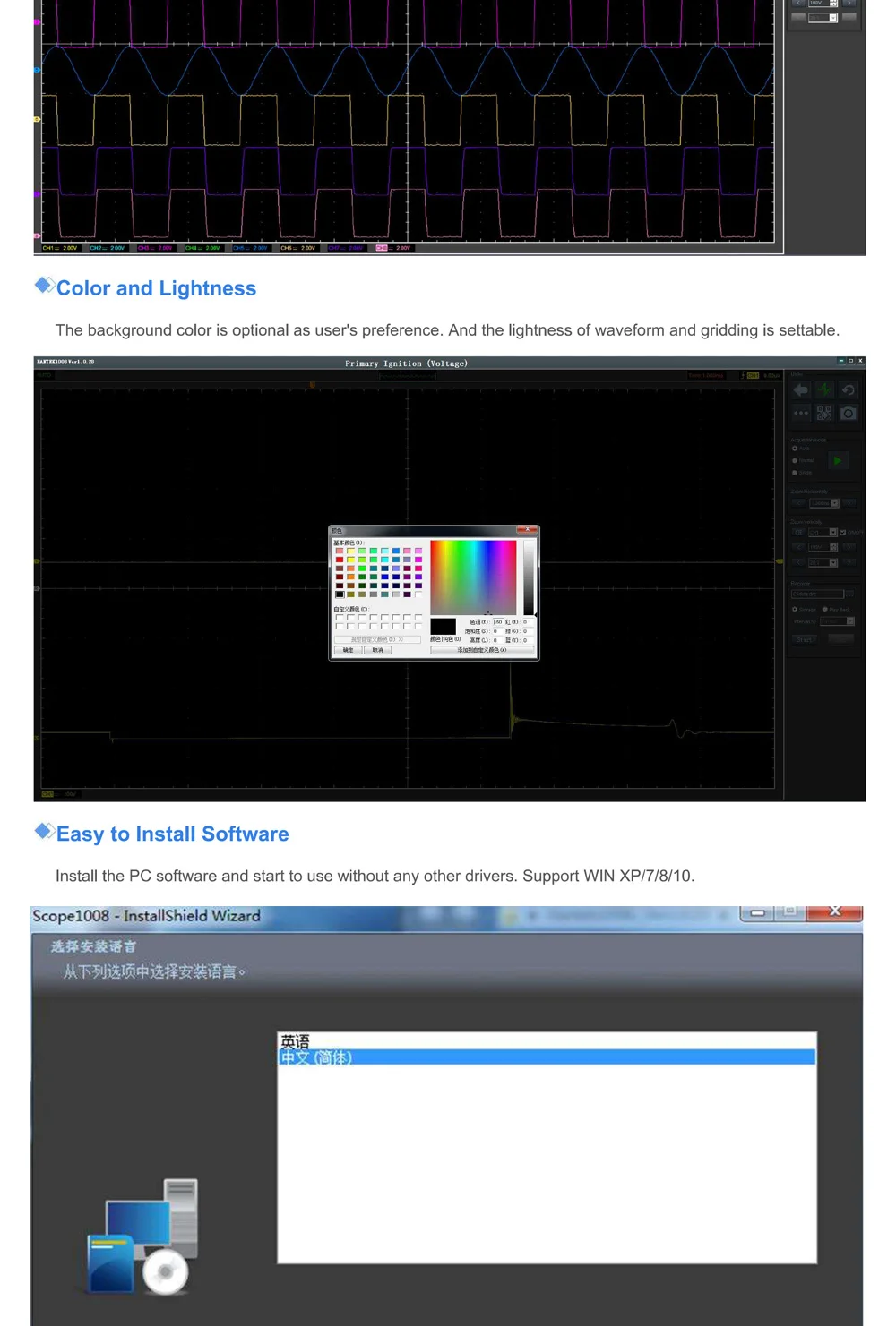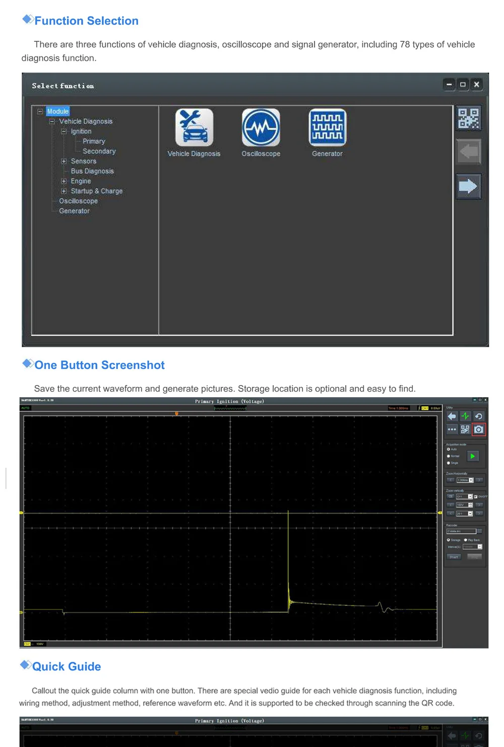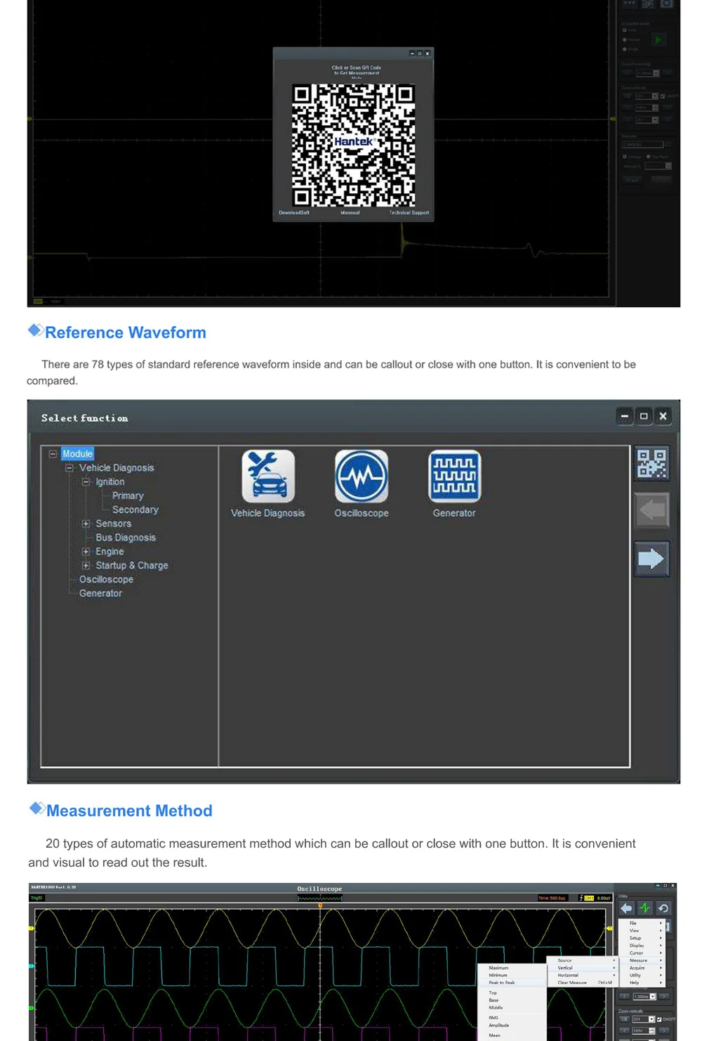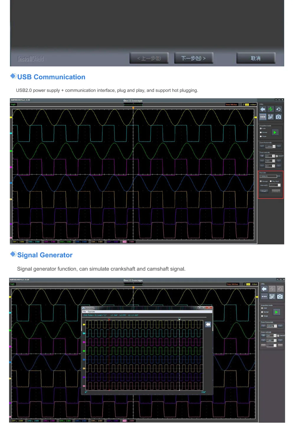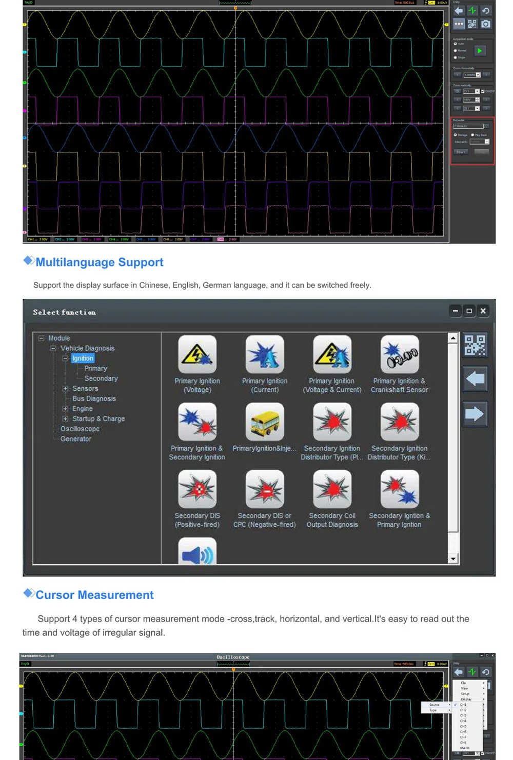 8-канальный осциллограф для тестирования автомобилей. Более 80 типов функций автомобильной диагностики (зажигание/датчик/шинаОбнаружение/перформация/цепи стартера и зарядки и т. д.)Функция помощи видео обеспечивает диагностику видео, которое можно смотреть онлайн.В результате диагностики можно сформировать отчет о диагностике., напечатать или сделать скриншот нажатием одной кнопки, множество методов сохранения данных.Поддерживается для записи сигналов в течение длительного времени. Может имитировать Распредвал и сигнал коленчатого вала.Передача сигналов через интерфейс USB 2,0 plug and play, не требует дополнительного источника питания.