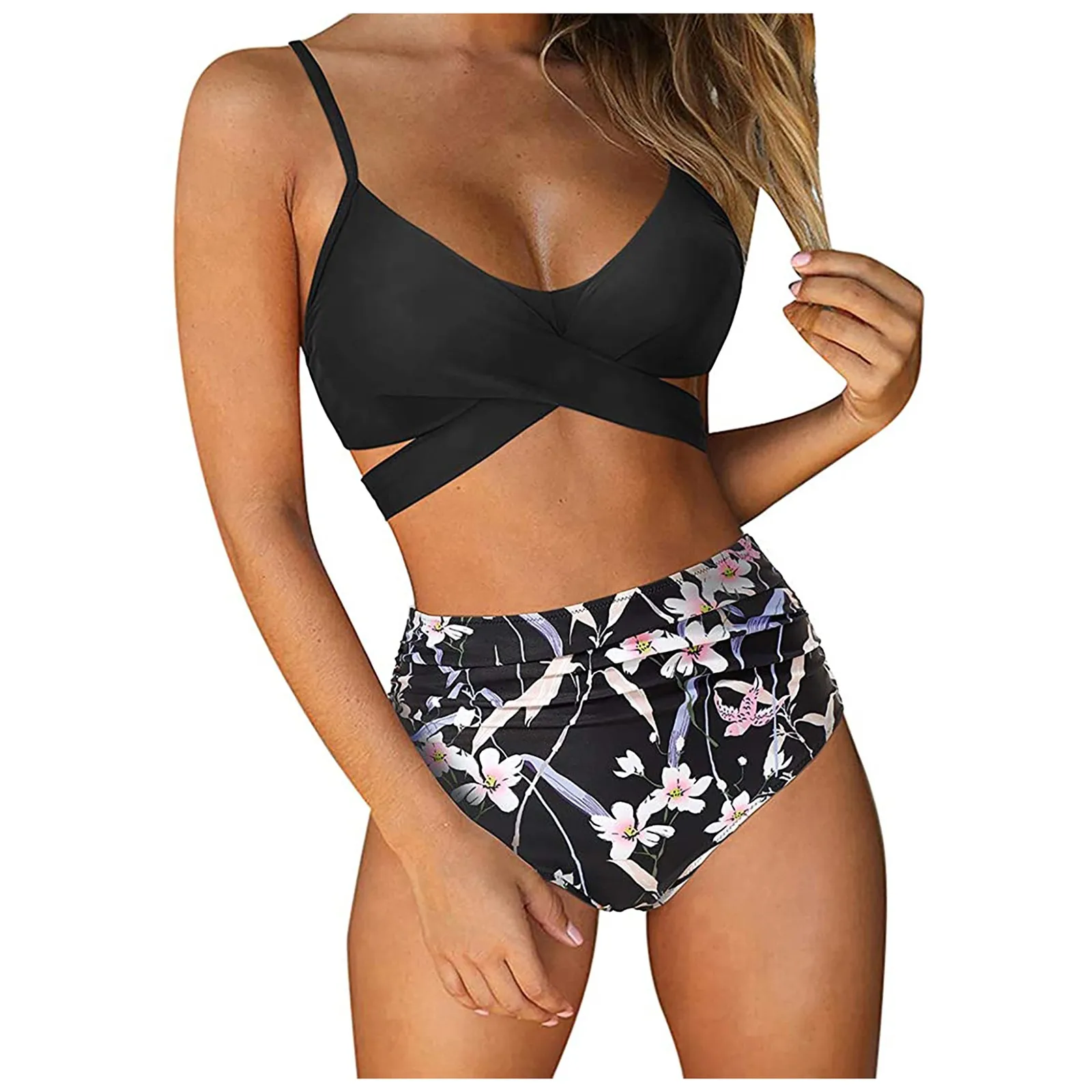 Бикини, 2 предмета, Раздельный комплект бикини с цветочным принтом, высокая талия, женский купальник, шорты, однотонные бразильские бикини, трусики