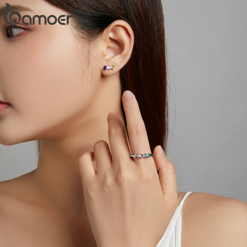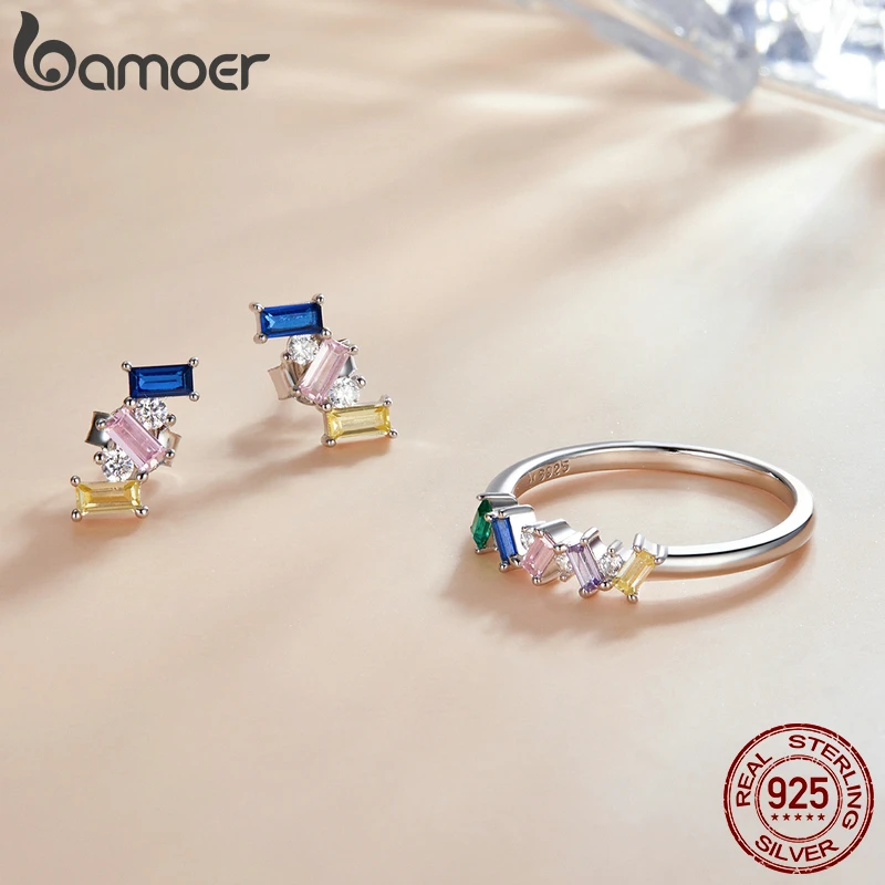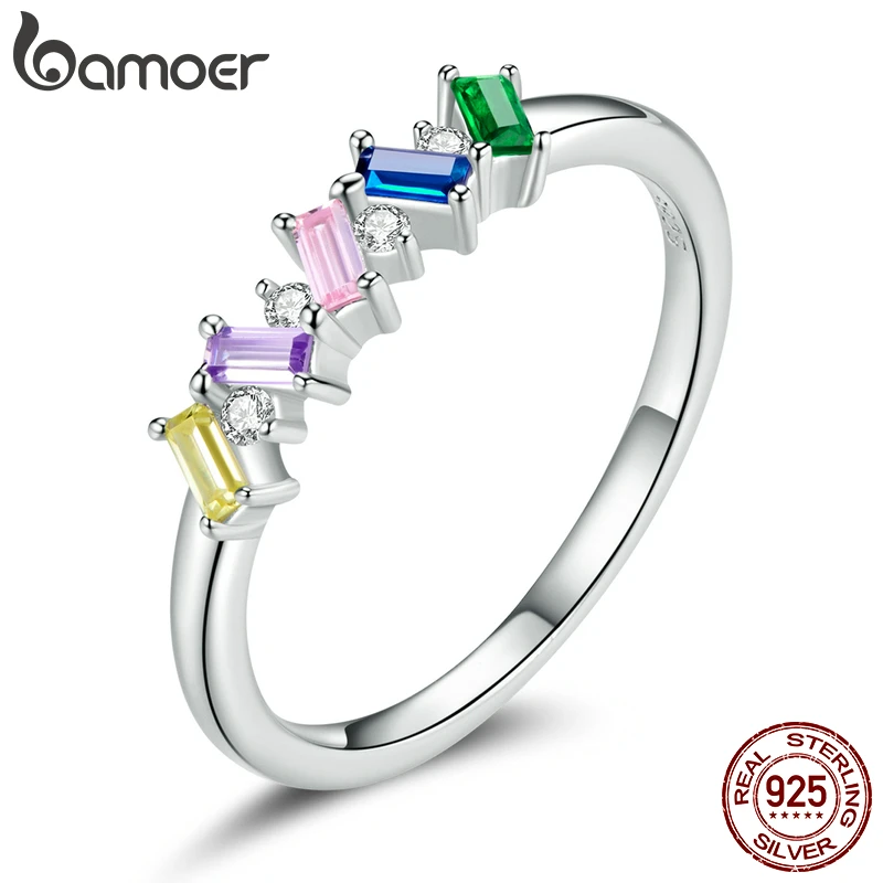Женское Винтажное кольцо bamoer, кольцо из стерлингового серебра 925 пробы с геометрическим рисунком, радужные квадратные камни, ювелирные украшения для помолвки, SCR743