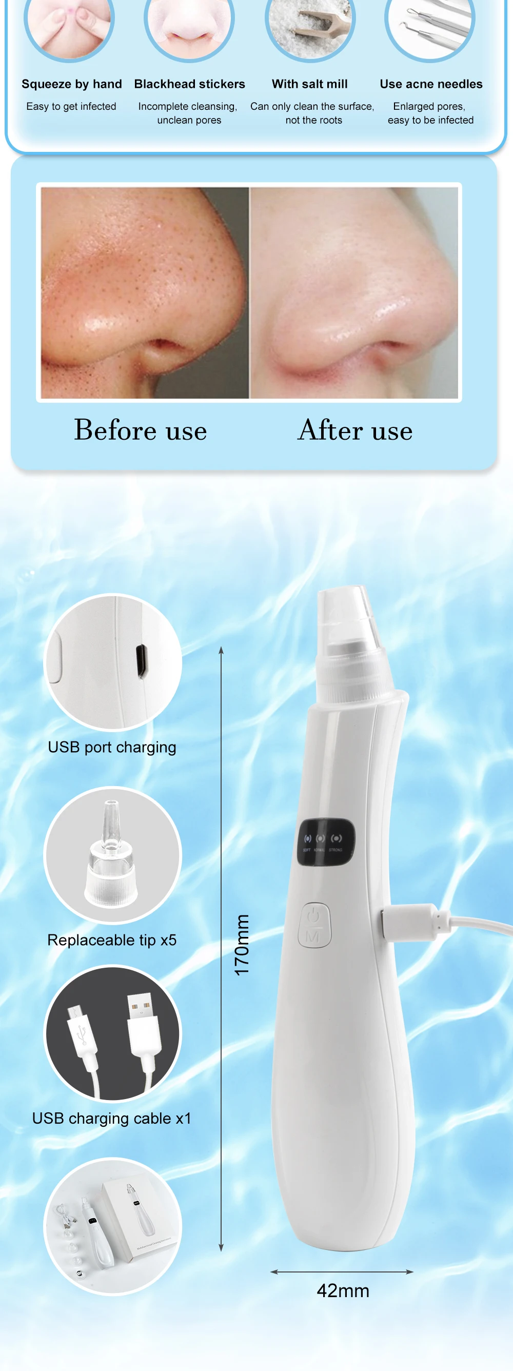 Способ применения1. Сначала очистите кожу лица. Затем используйте пароварку для лица или горячее влажное полотенце для окуривания кожи лица, чтобы открыть поры под действием горячего отпаривания.2. Выберите правильную шестерню в соответствии с вашими условиями кожи.3. Выравнивайте головку машины с кожей, которая требует ухода, но, пожалуйста, не двигайтесь вперед и назад, Двигайтесь в одном направлении, не рекомендуется использовать его в течение длительного времени.4. Очистите кожу после использования.(Если вы хотите лучшего эффекта, после окуривания лица, вы можете надеть маску для носа, а затем использовать инструмент для удаления черных точек.)Особенности:Мощный usb-аккумулятор, более удобный.Он поставляется с 3 уровнями всасывания для удовлетворения различных типов кожи, и защищает вашу кожу от повреждений, вы можете отрегулировать его в зависимости от тяжести черных точек и типов кожи.Упаковано с 4 различными зондами для решения всех ваших потребностей, удаления черных точек, жира, косметических остатков, прыщей, морщин с различных частей лица, также эффективно для микродермабразии, улучшая жизненный тонус кожи, помогает разбивать поры и делает кожу гладкой и подтягивающей.Этот прибор для удаления черных точек изготовлен из прочного АБС-материала, который использует высокотехнологичную вакуумную технологию всасывания, легко и быстро удаляет черные точки, акне, Липиды и т. Д.Инструкции по уходу за изделием1. Нанесите горячее полотенце или черные точки на кожу лица, держите ее в течение 5-10 минут, откройте поры и смягчите кожу;2. Выберите нужный наконечник и установите наконечник на основной блок;3. Медленно двигаясь по коже лица, пожалуйста, не оставайтесь в одном положении слишком долго, чтобы избежать кожи красного и фиолетового;4. После чистки, мыть холодной водой, наносить маску, использовать смягчающие средства правильно, держать лицо увлажненнымРазмер продукта: 13*4*5 смСпецификация:Материал: АБС + ППСпособ зарядки: USBНоминальное напряжение: 5V 1AНоминальная мощность: 3 ВтВремя зарядки: 3 часаВремя использования: 2,5 часовЦвет: белый