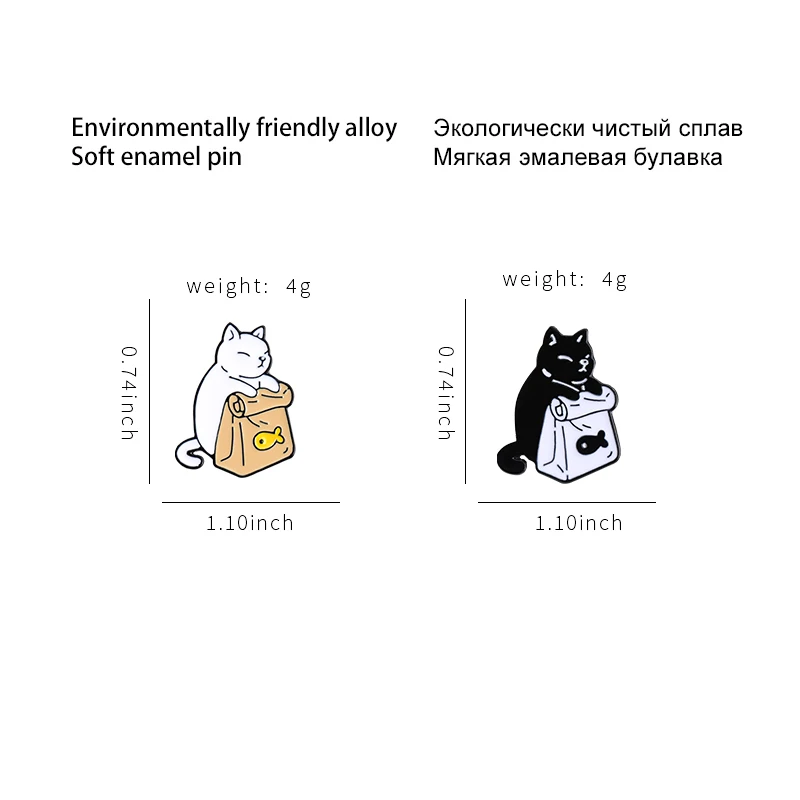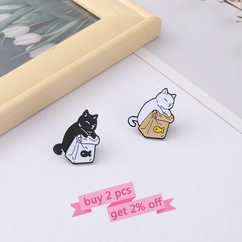 Эмалированные заколки кормить себя, Симпатичные черные и белые Коты, сушеные броши в виде рыбы и сумки, значок на лацкан, мультяшное животное, ювелирное изделие, подарок для детей, друзей