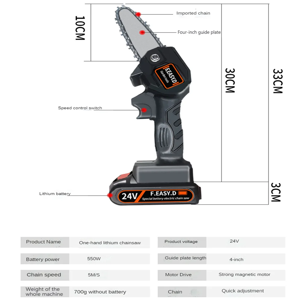 Мини - пила цепная аккумуляторная, 24 В, 4 дюйма , с литиевым аккумулятором