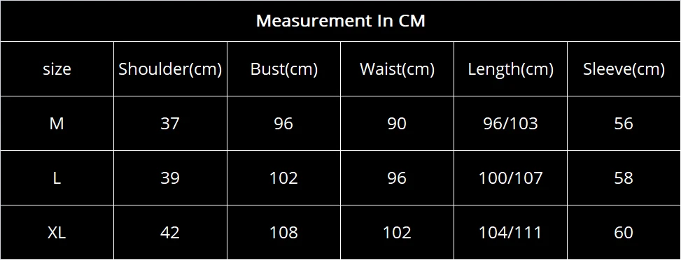 ✅Прямая поставка принимаетсяРазмер M, длина спереди 96 см, длина по спинке 103 см, обхват груди 96 см, обхват талии 90 см, ширина плеч 37 см, длина рукава 56 см, рост 158-165 см, вес 45-57,5 кгРазмер L, длина спереди 100 см, длина спины 107 см, обхват груди 102 см, обхват талии 96 см, ширина плеч 39 см, длина рукава 58 см, рост 158-168 см, вес 57,5-67,5 кгРазмер XL, длина спереди 104 см, длина спины 111 см, обхват груди 108 см, обхват талии 102 см, ширина плеч 42 см, длина рукава 60 см, рост 160-172 см, вес 67,5-77,5 кг