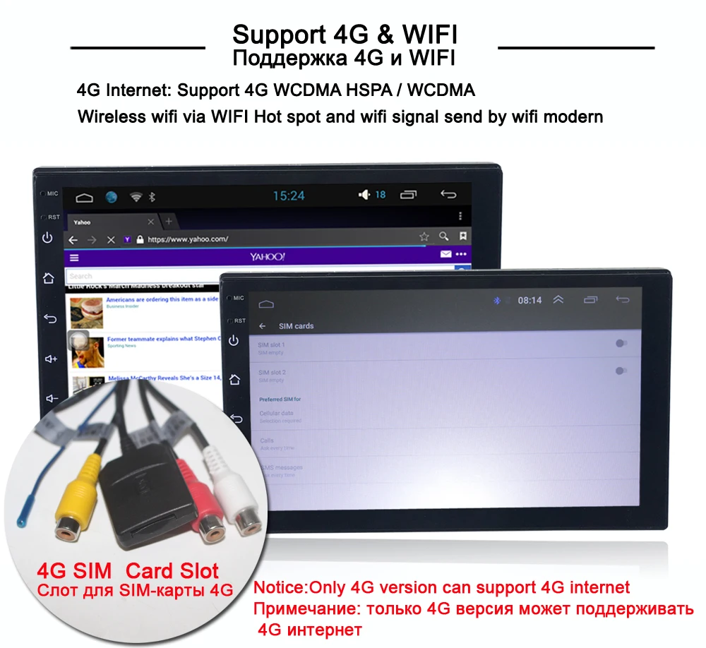 Основные функции:1:Bluetooth бесплатно.2: воспроизведение музыки с bluetooth3: камера заднего вида/запись привода DVR от заднего USB: Поддержка4:OBD: Поддержка5: холодный запуск около 17 секунд6: Встроенный микрофон: Поддержка7: управление рулем: Поддержка8:Wi-Fi: Встроенный/через телефон в качестве Wi-Fi горячей точки.9: поддержка приложений: многие, например:Google Play Store, Skype, Facebook, YouTube, Twitter,waze и т. Д.10: поддержка 1080P + Поддержка музыки без потерь11: Интернет в автомобиле 4G (не входит в комплект sim-карты), поддержка только версии 4G12: поддержка GPS карты, такие как Google online MapYandex.navi/Waze on Line CityGuide.13: мульти OSD Languaes: английский/русский/французский/немецкий/испанский/итальянский/арабский/Португальский/Турецкий/тайский/Польский/иврит и т. д. 60 видов языка14: этот блок не имеет dvd-механизма и не может воспроизводить dvd-диски. Название этого устройства-dvd-плеер, но на самом деле это полноэкранный автомобильный блок. Перед покупкой, пожалуйста, узнайте об этом15: Выберите логотип автомобиля, который вам нравится.16:Rca кабели для сабвуфера17: Легкий в росте, просто подключите непосредственноЧто входит в посылку?Автомобильное радио x 1 шт. (встроенная карта)Разъем питания x 1 шт.USB кабель x 2 шт.Кабель RCA x 1 шт.Антенна GPS x 1 шт.Входной кабель камеры заднего вида x 1 шт.Антенна 4G x 1 шт. (только для версии 4G)