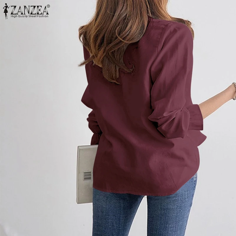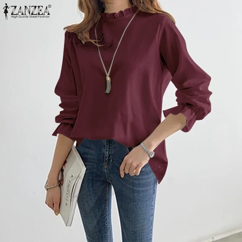 Модные хлопковые однотонные топы ZANZEA, женские топы с длинными расклешенными рукавами, круглым вырезом и оборками, эластичная Весенняя блузка с манжетами, офисные рубашки оверсайз