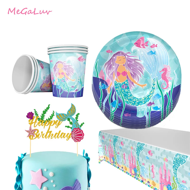 Посуда в стиле русалки, бумажные тарелки, кружка, скатерть, перьевой патрон, капкейк, топперы, обертки, Baby Shower, украшения для дня рождения