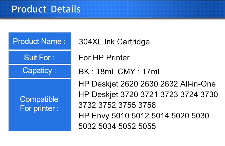 Cartridge numberReplacement For HP304 BK for HP304 Tri-Color