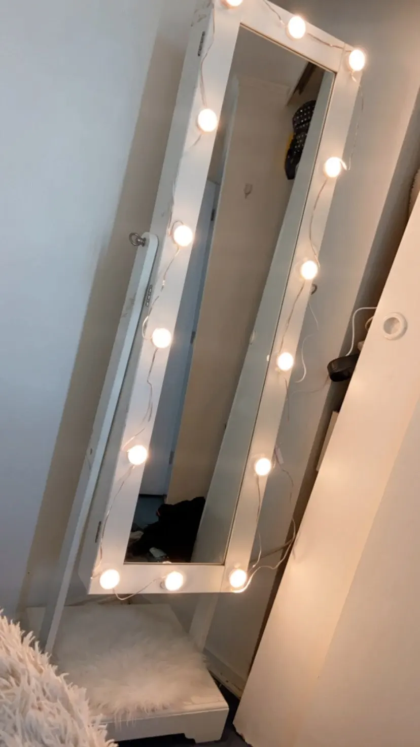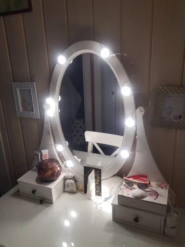 слабо светит даже с 14 лампочками. круг лица можно осветить, для нормального зеркала - мало яркости - она регулируется и на максимуме мне не хватает. и угол освещения маловат - близко к зеркалу попадаешь в тёмную зону