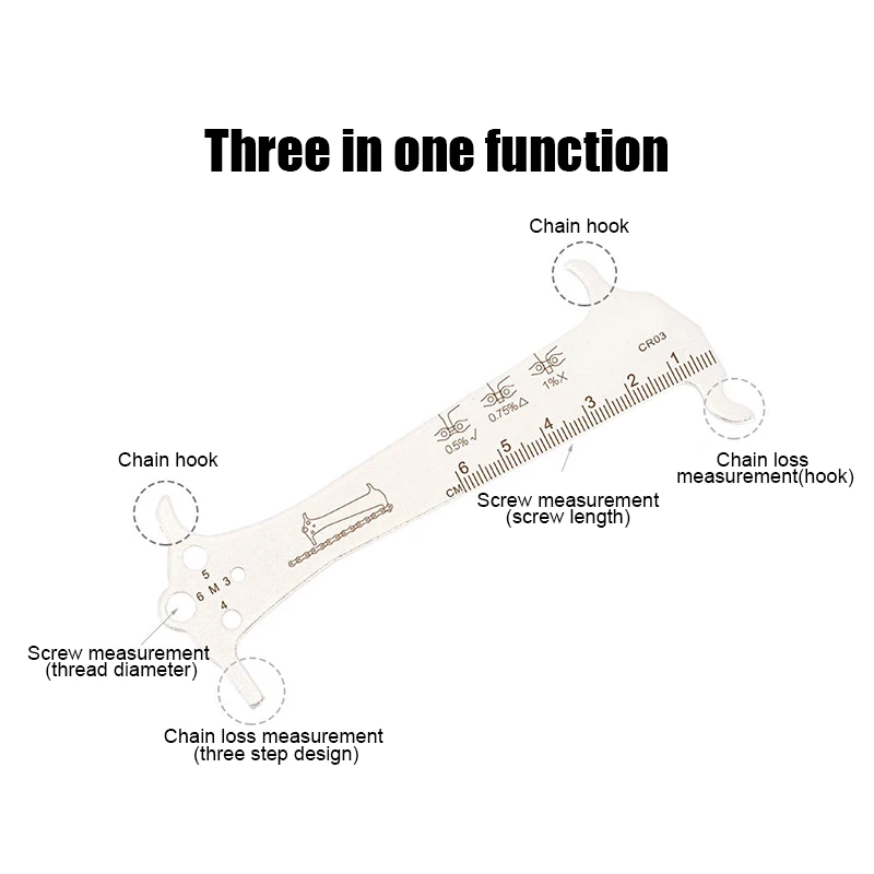 Функция «1,3 в 1»: измерение потери цепи/измерение цепного крючка/винта2. Пескоструйный процесс: глянцевый и без заусенцев общий Пескоструйный процесс, высокий блеск3. Три части измерения: трехступенчатая конструкция: 0.5%-0.75%-1%, более детальная ситуация измерения, более знающие о потере цепи, конечно, трудность обработки также гораздо больше4. Дизайн цепного крючка: легко работать с обслуживанием цепи, больше не спешите, хороший компаньон для цепи5. Функция измерения винта: Винтовая измерительная линейка интегрирована в измерительное устройство цепи, что значительно увеличивает стоимость работы инструмента. Он может быстро измерить диаметр резьбы и длину винта, что удобно и практично.