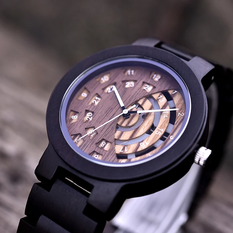 Для Мужчин's эбенового дерева часы 100% Плетеный абажур из натурального дерева кварцевые часы с полным с разноцветным деревянным ремешком регулируемой 24 часа в сутки Дисплей легко читать оптовая продажа