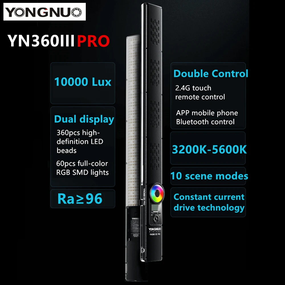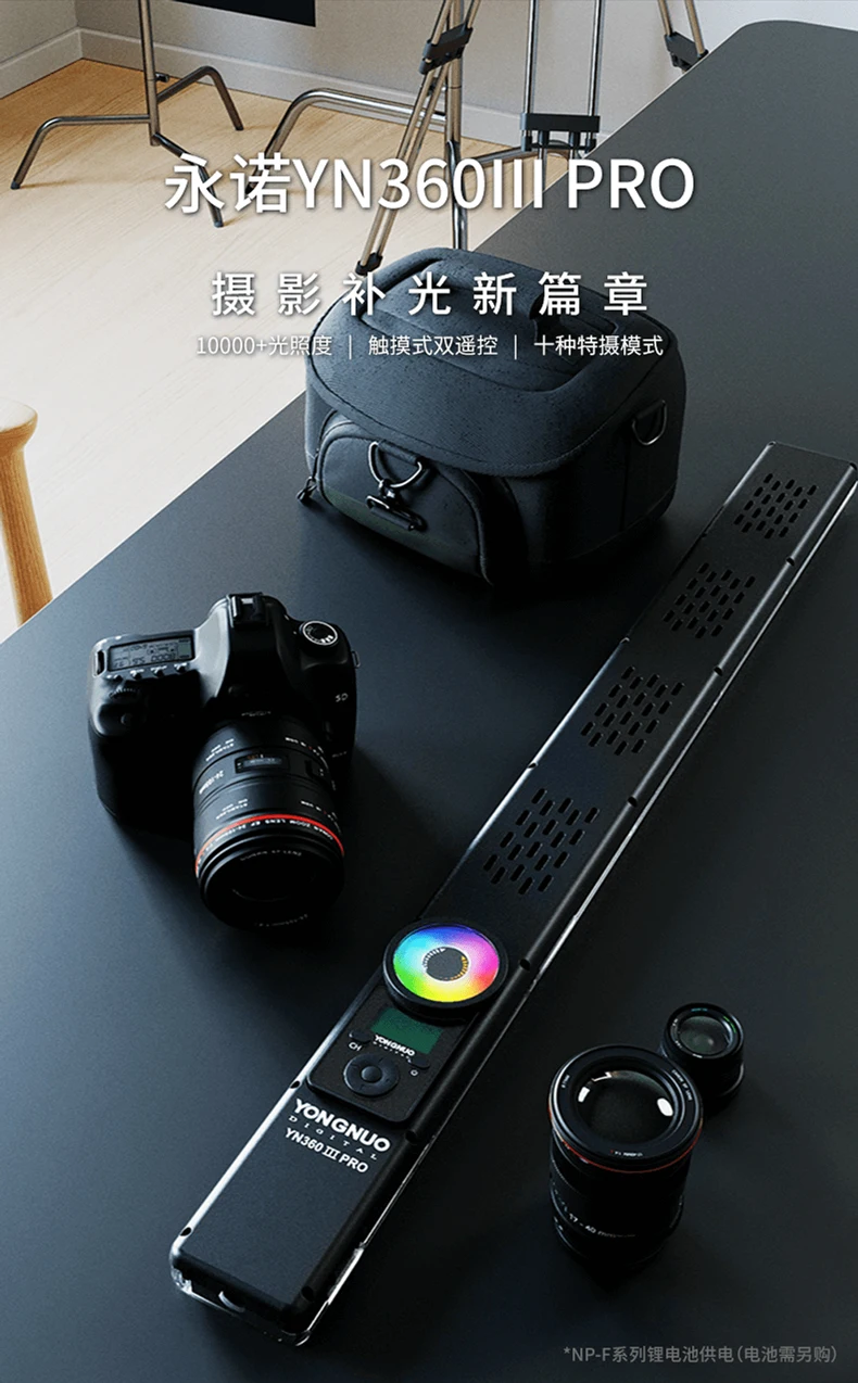 Yongnuo YN360III Pro ручной светодиодный светильник для видео с сенсорным регулированием Bi-colo 3200k до 5500k RGB заполняющий светильник с пультом дистанционного управленияYN360III Pro 5500KОснащен фирменным пультом дистанционного управления с сенсорной панелью, через сенсорную панель на пульте, режим освещения и яркость можно легко регулировать, сигнал срабатывает на ощупь, функция затемнения является точной и надежной, что легко достичь требуемого дополнительного эффекта освещения.С YN360III вы можете имитировать 10 различных специальных дополнительных режимов освещения, таких как молния, восход солнца, мигающие огни полицейских транспортных средств, чтобы лучше удовлетворить требования пользователя.Состоит из цветного полноцветного режима RGB и естественного заполняющего светильник 3200k, цветового температурного режима 5600k, двух режимов автономной работы, легко переключаться в требуемый режим с помощью одной кнопки. Поддерживает беспроводной триггер вспышки YONGNUO светодиодный Беспроводная система управления, YN360III может осуществить взаимное общение и синхронной функции управления с другими Светодиодная лампа для видеосъемки YONGNUO светодиодный свет.Обеспечивает полный цвет RGB, вы можете не только получить заполняющий светильник с различными цветами через сенсорную панель дистанционного управления, но и выбрать свой собственный уникальный цвет через цветовую палитру в приложении на мобильный телефон.В YN360III ламповая панель длиной до 40 см, значительно расширения светильник угол, который очень подходит для стерео и широкоугольный светильник дополнение. Принимает 360 хорошо подобранных высококачественных лампочек с большим светящимся чипом, индекс цветопередачи больше или равен 95, YN360III может идеально восстановить истинный цвет объекта.YN360 III Модернизированный Pro светодиодный видео светильникДва режима питания1. Применимый аккумулятор: NP-F550, NP-F750, NP-F9702. Поддерживает внешний источник питания постоянного тока для длительного использования, применимое напряжение: 12 В 2A (пожалуйста, не используйте источник питания ноутбука).* Принимает Светодиодная лампа для видеосъемки YONGNUO светодиодный Постоянное Текущее Вождение технологии специально разработан для светодиодный видео светильник, светильник Выход работает стабильно и интуитивно понятный, фотографический эффект более надежна.ПараметрыЦветовая температура: 3200K, 5600K и RGB полный цветИндекс цветопередачи: больше или равен 95Удаленное Расстояние: менее 15 метровМощность: 21,6 W и 10,8 WСветовой поток: 2790лмВес: около 80 гУгол освещения: 55 градусов и 110 градусовВнешний источник питания постоянного тока: 12 В 2 а постоянного токаРазмер: 583*48*24 мм* Две модели YN360III на ваш выбор, белый цвет-состоит из 360 лампочек 5600K и 60 RGB SMD светодиодов, био-цвет-состоит из 180 ламповых бусин 3200K и 180 ламповых бусин 5600K и 60 RGB SMD светодиодов.YN360III Pro 3200K-5500KОснащен фирменным пультом дистанционного управления с сенсорной панелью, через сенсорную панель на пульте, режим освещения и яркость можно легко регулировать, сигнал срабатывает на ощупь, функция затемнения является точной и надежной, что легко достичь требуемого дополнительного эффекта освещения.С YN360III вы можете имитировать 10 различных специальных дополнительных режимов освещения, таких как молния, восход солнца, мигающие огни полицейских транспортных средств, чтобы лучше у