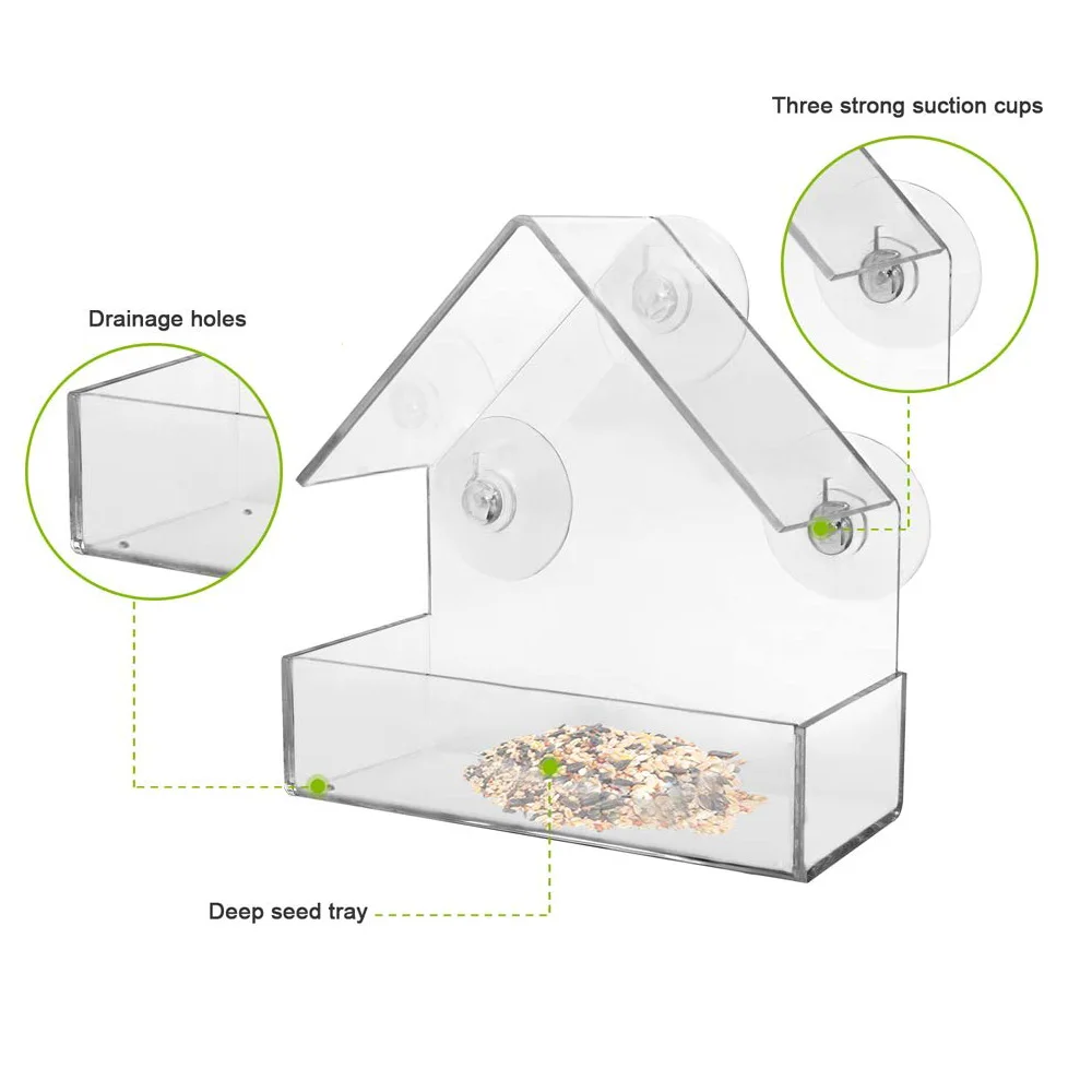Прочный и прозрачный акриловый материал, он изготовлен из обеспечивает долгий срок службы, легко чистится и позволяет видеть птиц под любым углом, не препятствуя обзору самой кормушкой для птиц