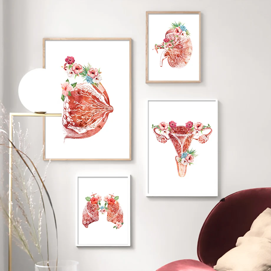 Настенная Картина на холсте с изображением цветов, груди, матки, почек, печени, скандинавские постеры и принты, картины для врачей, офисное украшение