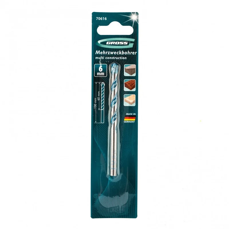 Сверло Multiconstruction PRO торговой марки GROSS относится к режущим инструментам и предназначено для получения отверстий в твердых материалах: бетоне, камне, кирпиче, шифере, стали, керамике. Корпус сверла длиной 100 мм и диаметром 6 мм изготовлен из специальной легированной стали и имеет высокую твердость за счет закалки токами высокой частоты. Режущая пластина Ceratizit надежно удерживается высокопрочным припоем, а острота достигается путем многократной алмазной заточки. Инновационная глубокая спираль обеспечивает быстрый отвод сверлильной пыли и шлама, тем самым продлевая срок службы сверла.