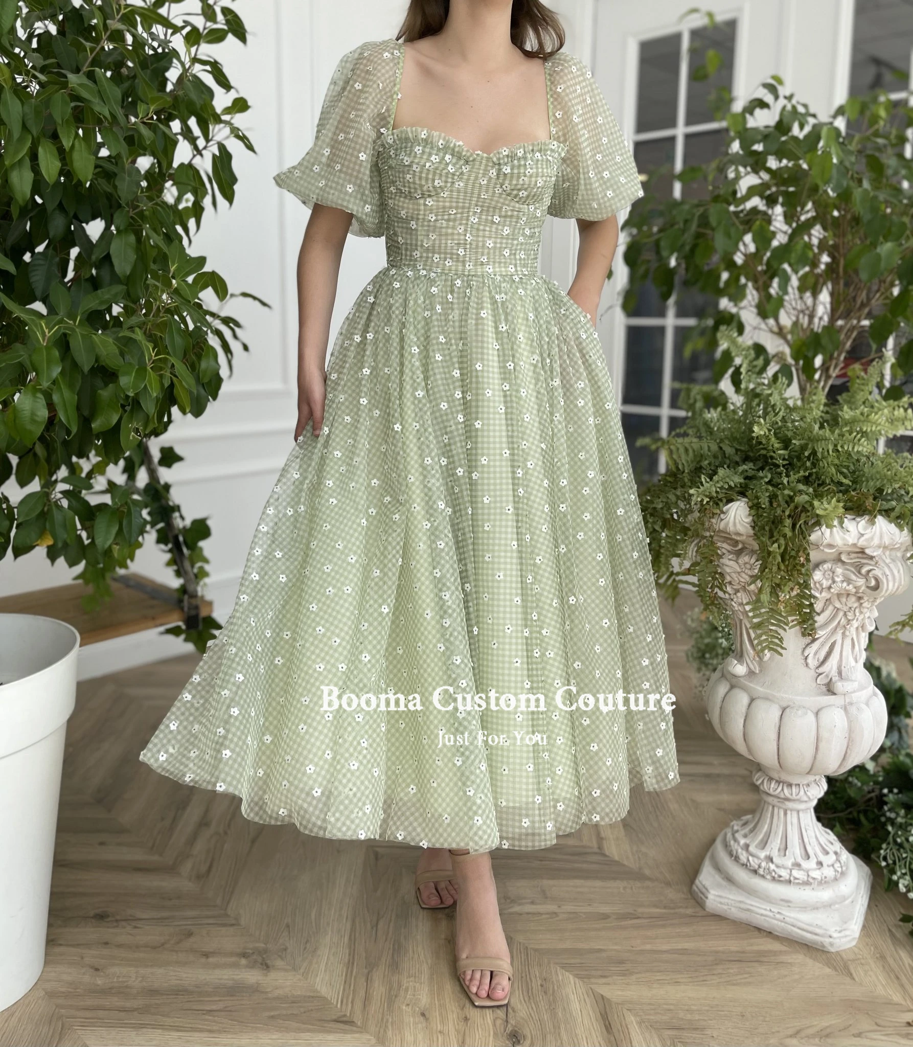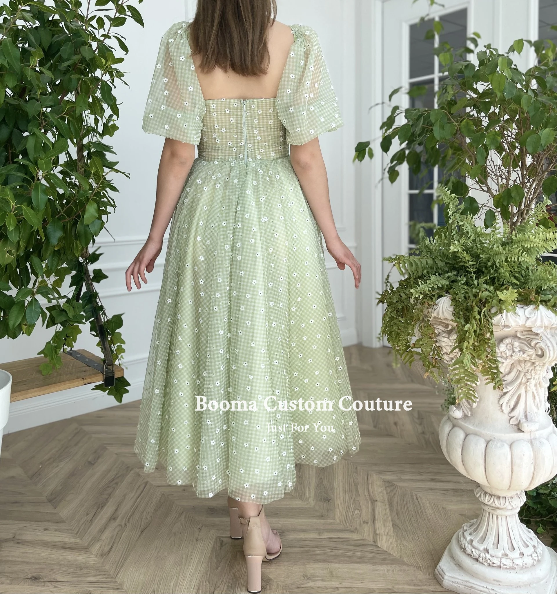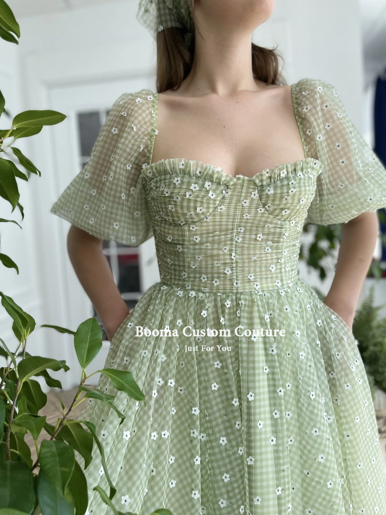 Booma зеленого цвета в клеточку с фатиновой юбкой-миди Выпускные платья с короткими пышными рукавами цветы Чай-Длина трапециевидной формы Платья для вечеринок с открытой спиной и праздничные платья для девочек
