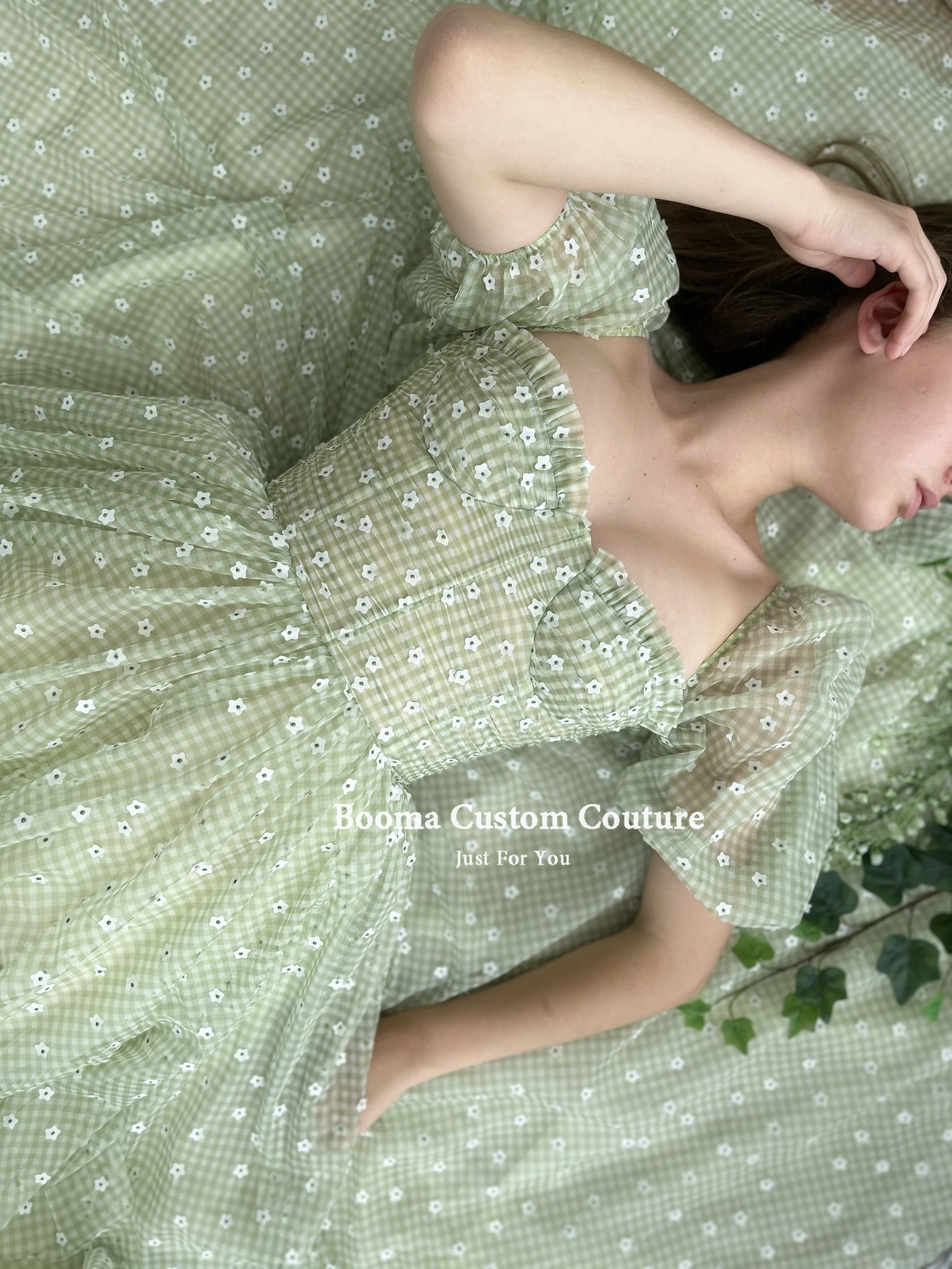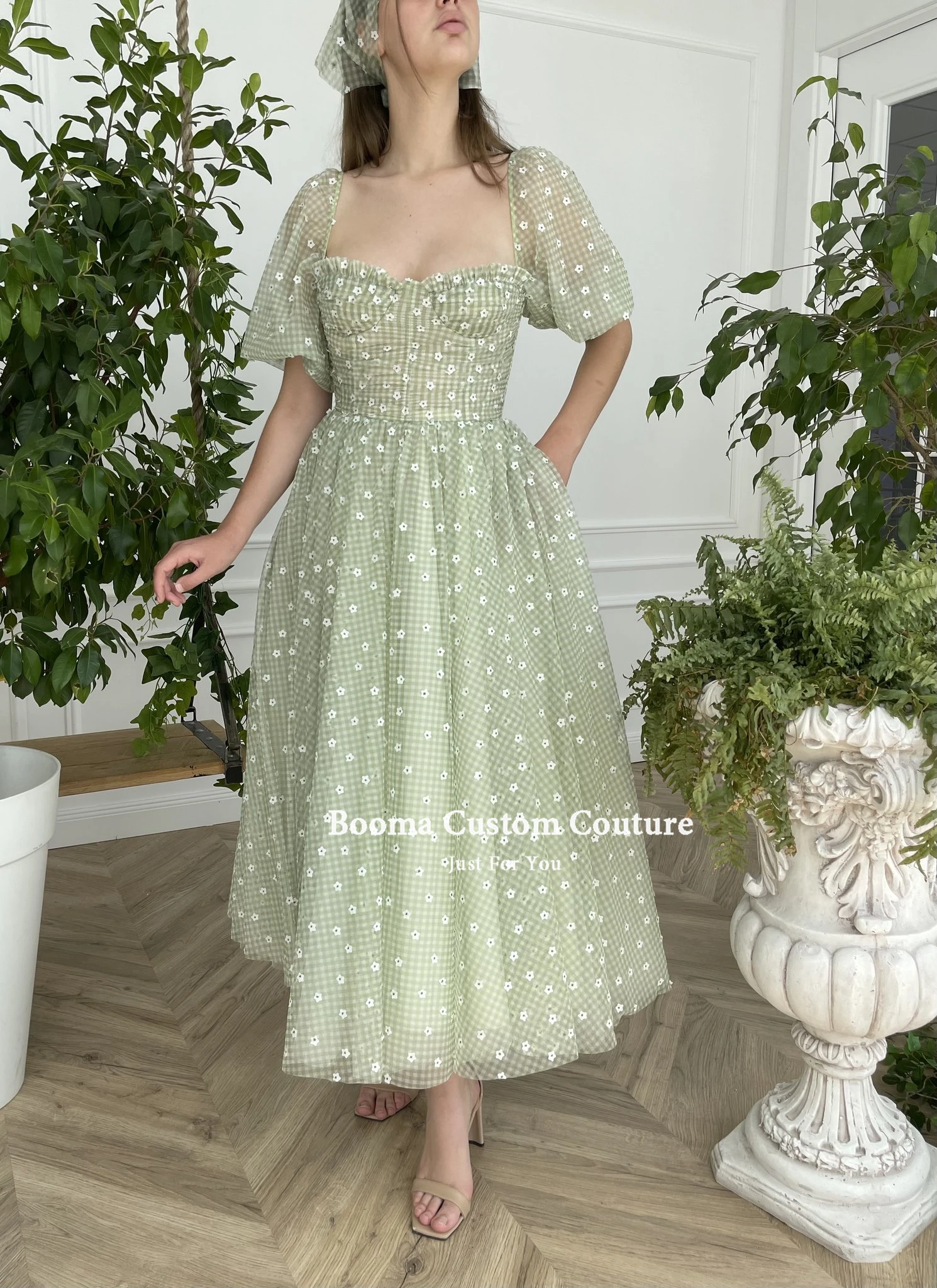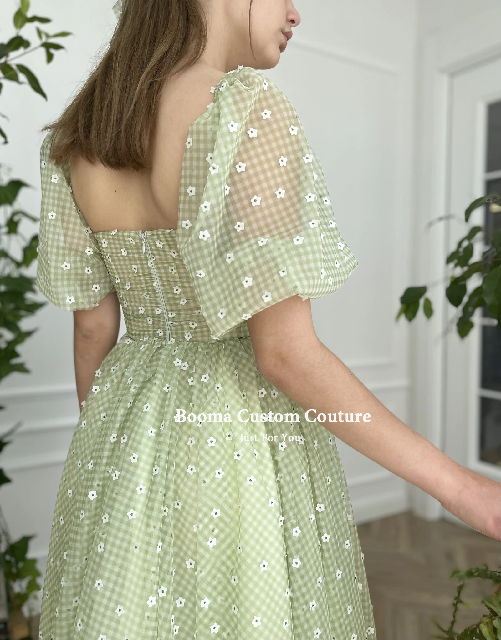 Booma зеленого цвета в клеточку с фатиновой юбкой-миди Выпускные платья с короткими пышными рукавами цветы Чай-Длина трапециевидной формы Платья для вечеринок с открытой спиной и праздничные платья для девочек