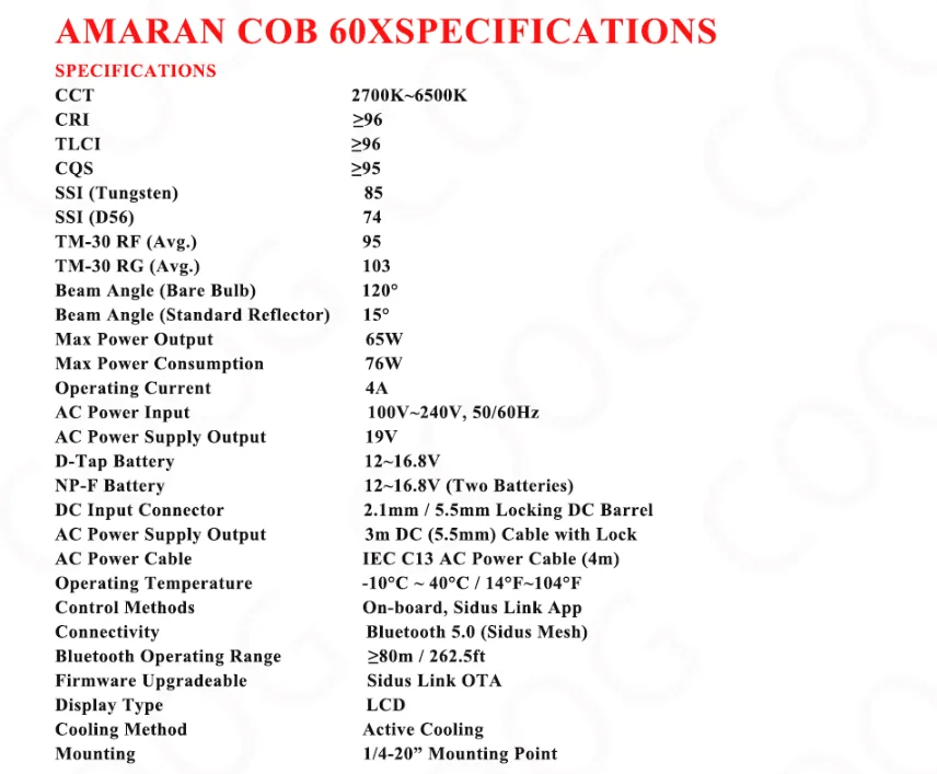 COB 60X Operating Temperature-10°C ~ 40°C / 14°F~104°F