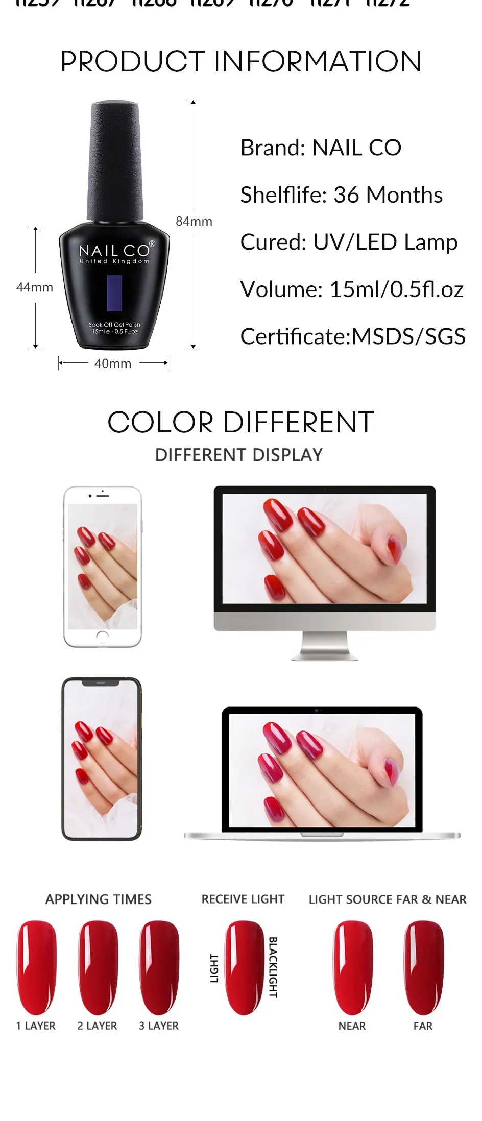 Профессиональное использование:Шаг 1. Очистите ногти, затем обрежьте поверхность ногтей как обычный процесс маникюра.Шаг 2. Полностью встряхните лак, он может сделать цвет полировки сбалансированным. (ВАЖНО)Шаг 3. Сначала нанесите базовый гель, который может сделать лак длительным, высушить УФ-лампой или светодиодный лампой. (Необходимо)Шаг 4. Нанесите лак напрямую, вылечите УФ-лампой в течение 2-3 минут или вылечите светодиодный светильник в течение 60 секунд; При высыхании нанесите второй слой и снова закрепите УФ-лампой или светодиодный светильник.Шаг 5. Пальто со съемным верхним покрытием, которое может сделать цвет более блестящим, излечивается УФ-лампой или светодиодный лампой.