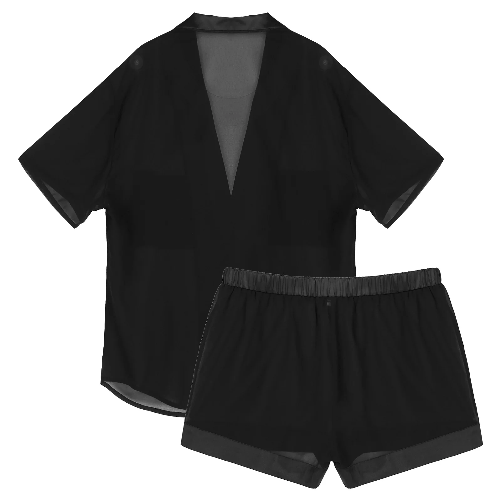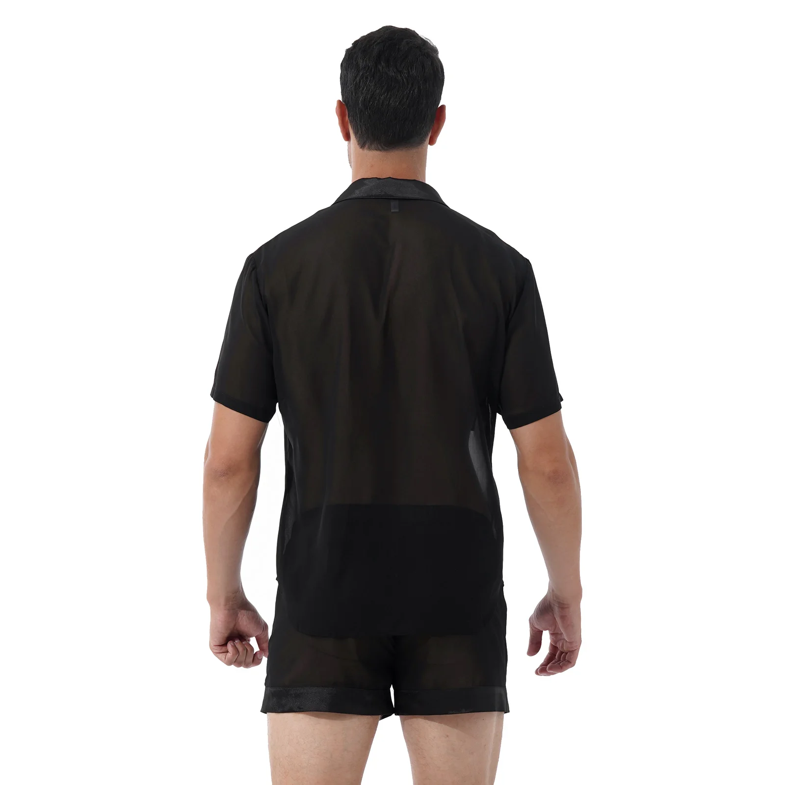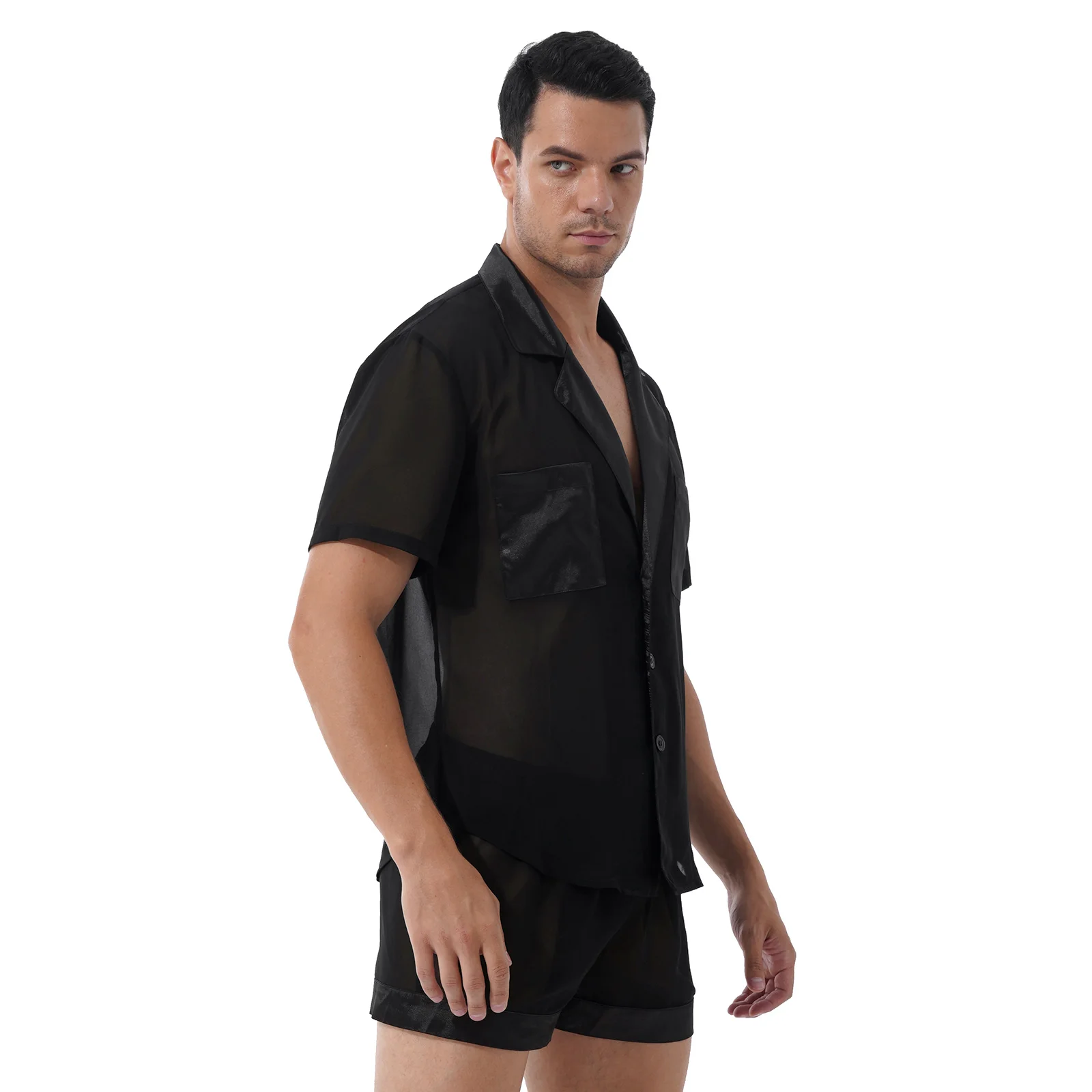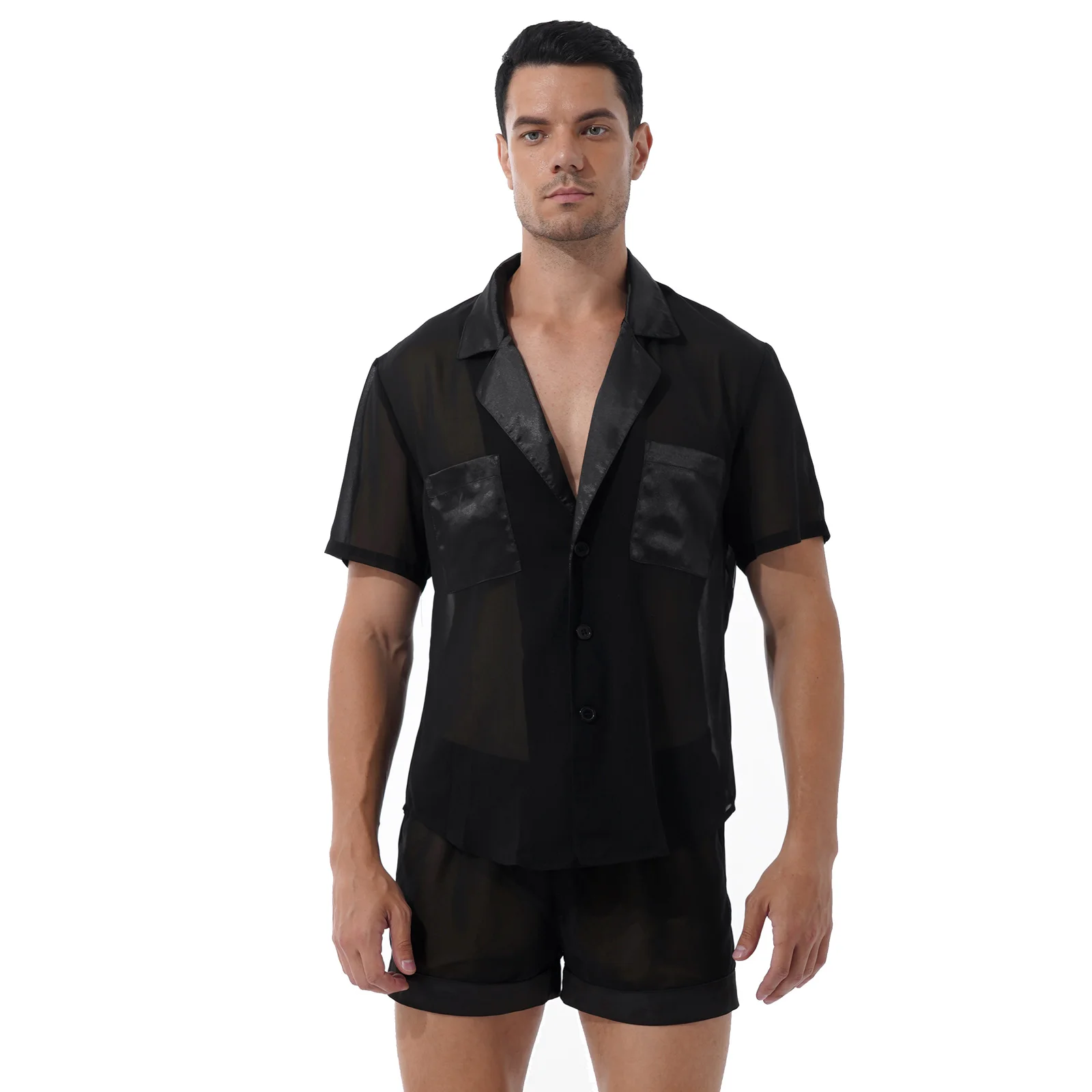 Мужской Прозрачный шифоновый пижамный комплект, атласная пижама в стиле пэчворк, ночная рубашка с отложным воротником, топ с короткими рукавами и шорты.